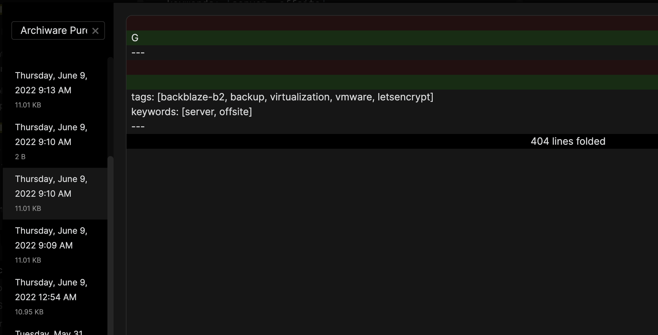 When I switched back to the note that I happened to be on when I pressed ⌘N (filename: “Archiware Pure free backup solution for VMware ESXi.md”) I saw it had been truncated to just the letters Go, screenshot: