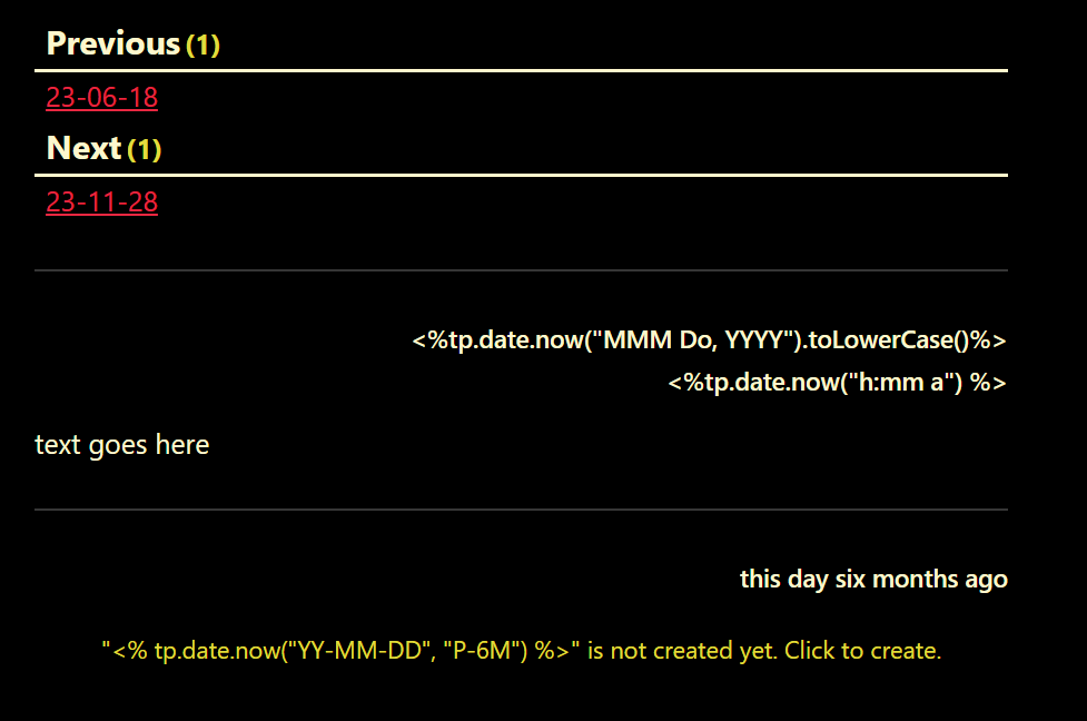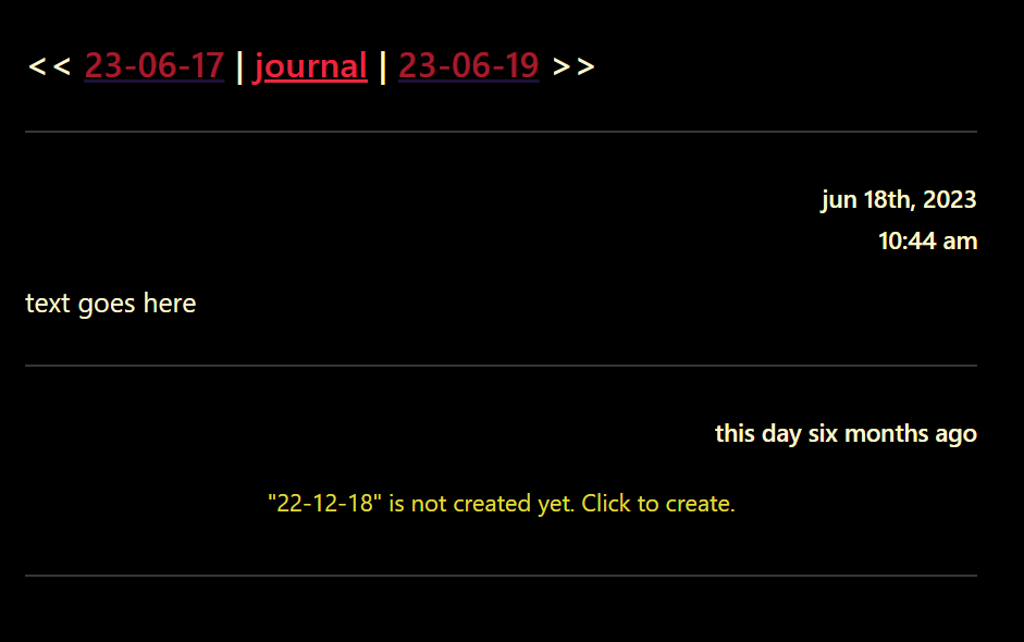 It automatically generates my daily journal page, and creates a few pretty links to the previous day, next day, 6 months ago and my index of journal pages. So far so good. I do not really journal everyday, so I was wondering if I could use data queries to dynamically search and show the next existing file instead of the next day.