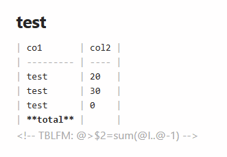 <!-- TBLFM: @>$2=sum(@I..@-1) -->