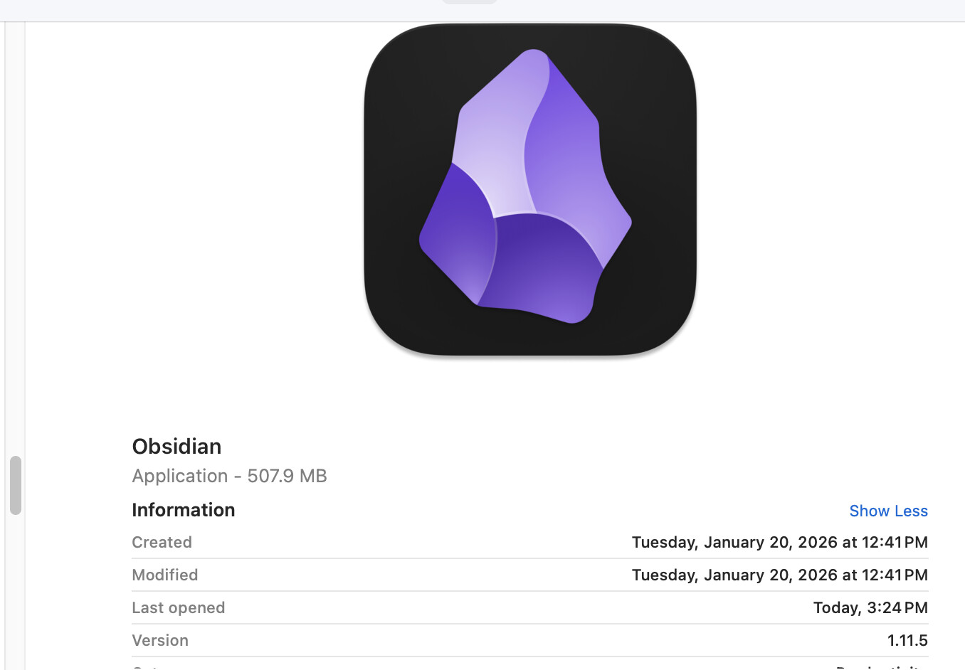 Looking at the app directly in Finder, the version is correctly shown as 1.11.5 (screenshot attached). But inside Obsidian, under About Obsidian, it shows 1.11.7. Clicking Check for updates reports that the app is up to date.