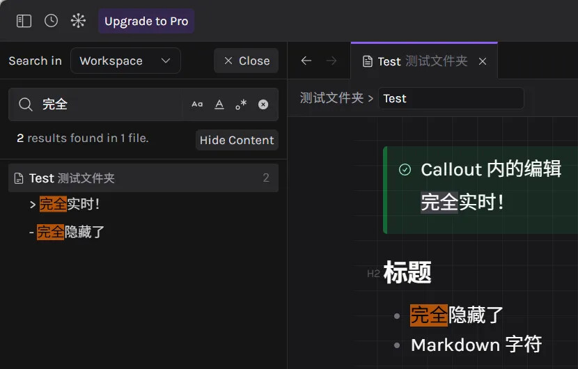 In-file search (when clicking results in the left global search, this search box will automatically open)Here OB isn’t far behind, rather it provides more powerful search syntax. In comparison, Octarine has more clickable buttons.