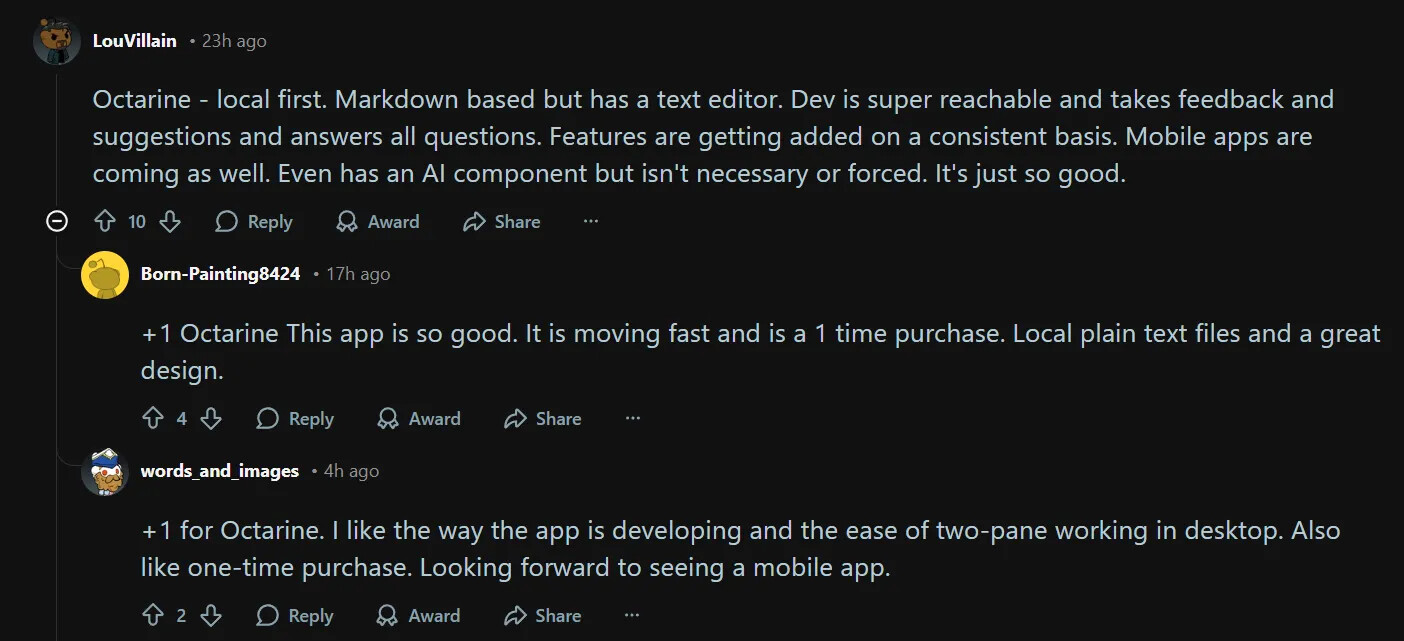 When I was browsing the post Best PKM Apps for 2026: Which one is working for you? : r/PKMS, one answer caught my attention: