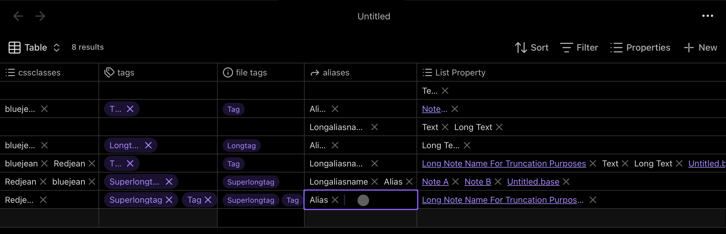 This only occurs for columns representing properties added to a note that allow multiple values: List/cssclasses/aliases/tags (single value type properties are not affected).