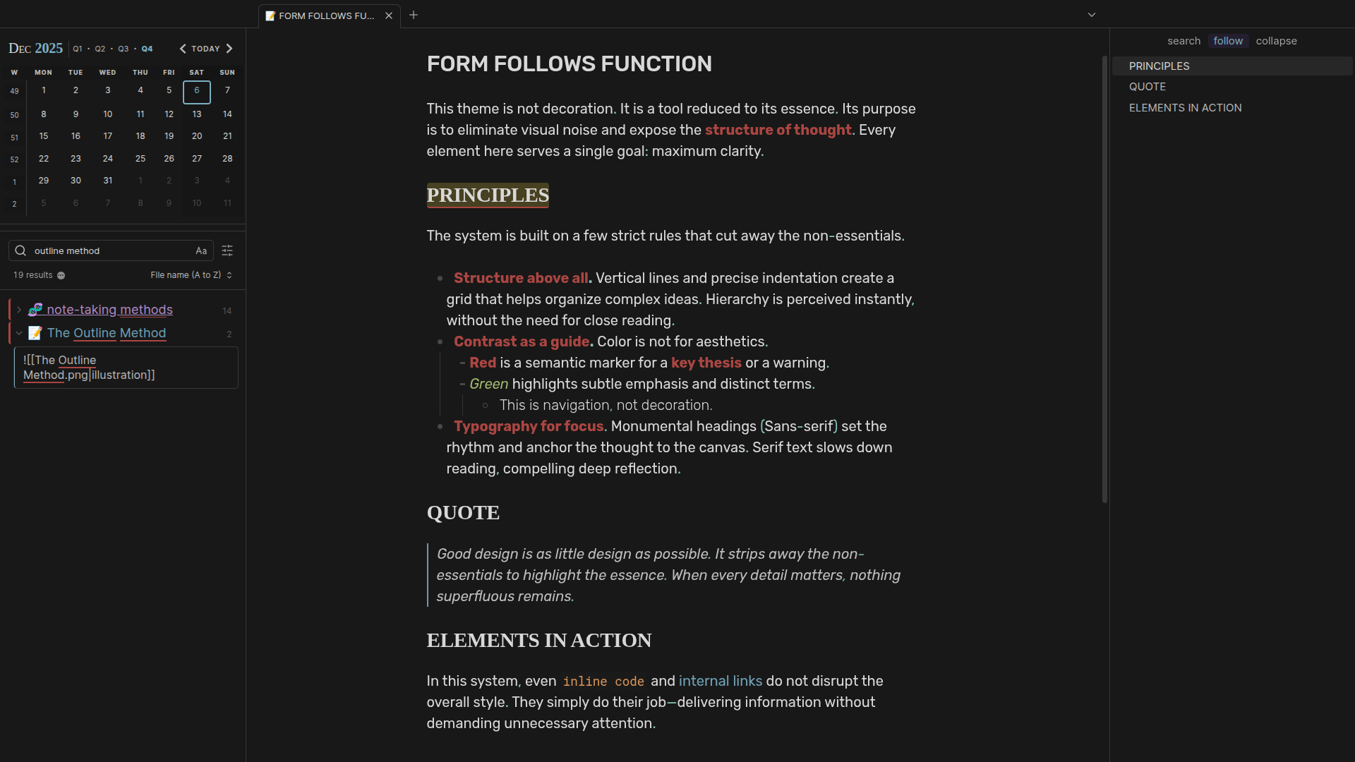 Engineering-grade theme for those who treat Obsidian as an IDE for thought. No decorations, just structure.