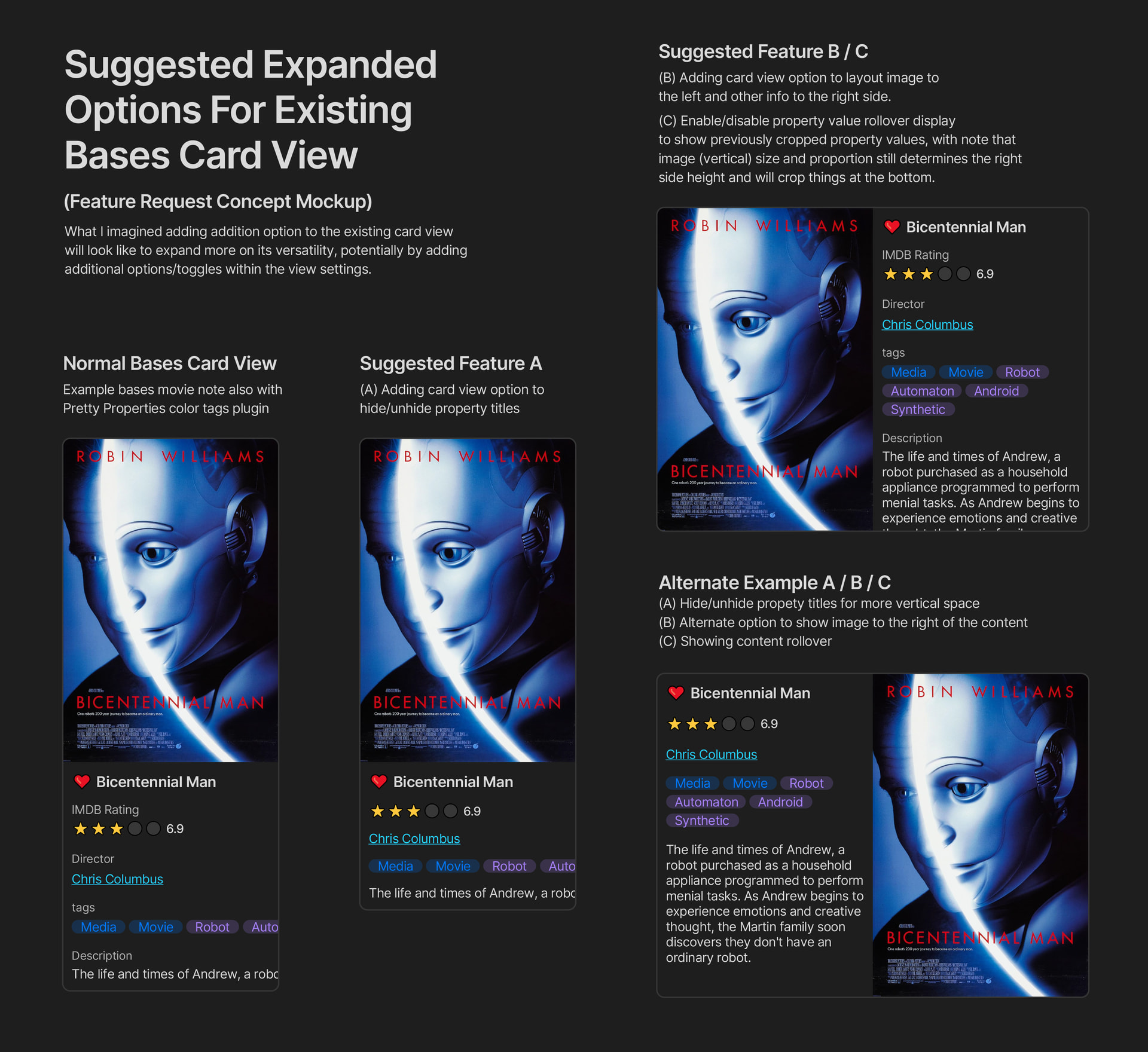 My goal for this visual mockup is to show that adding a bit more feature to the existing bases card view will allow it to be more versatile in showing more info within different layouts. The default bases card view is great but with other options such as Tables / Lists / Maps, they have some way to tweak how it looks within their respective view settings. Doing a similar expanded option in the cards view would be really helpful for certain use cases such as historical character cards, expanded topic with more description text, and other cases.