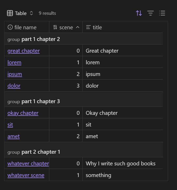 But if you don’t want to change your properties to hold links, you could modify your concept of the base to one that simply returns all your chapters and scenes grouped by act-chapter numbers and sorted by scene number. For example: