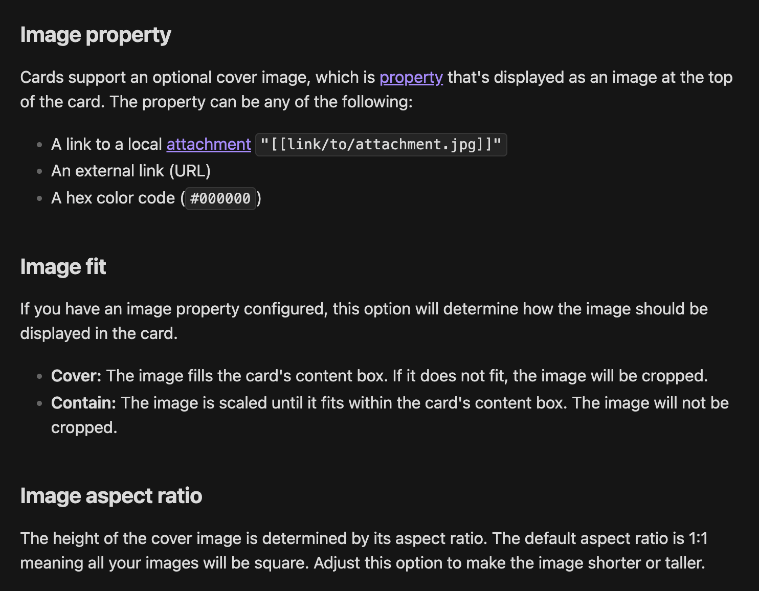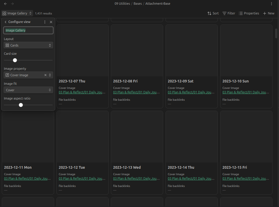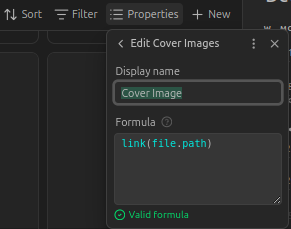 Go over to Configure View, select Cards layout, and for âImage propertyâ select the formula name you created in properties. You should see your images and links to the notes theyâre attached to.