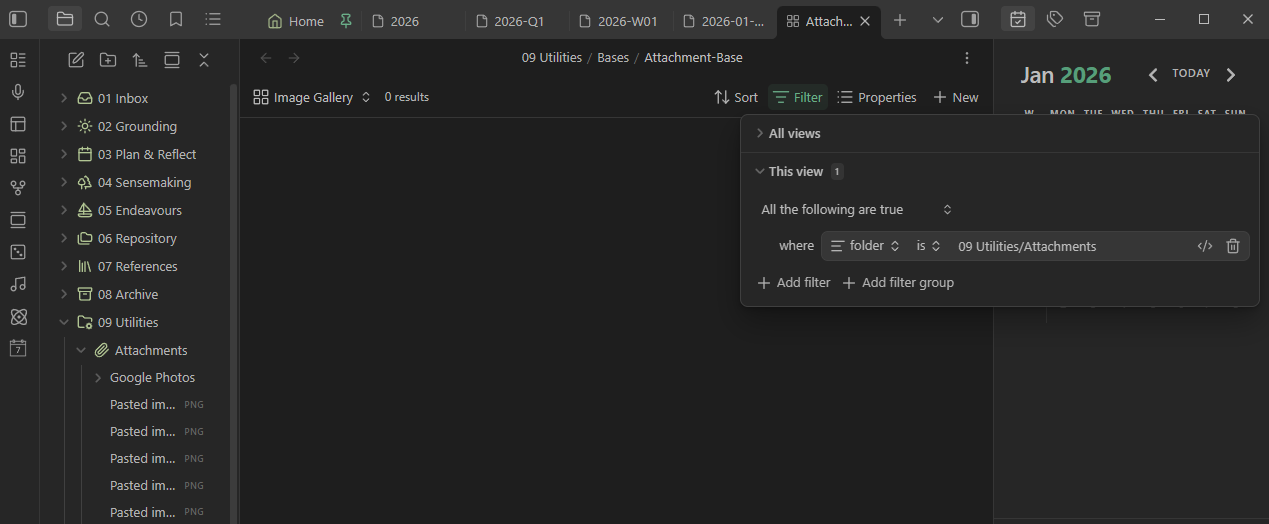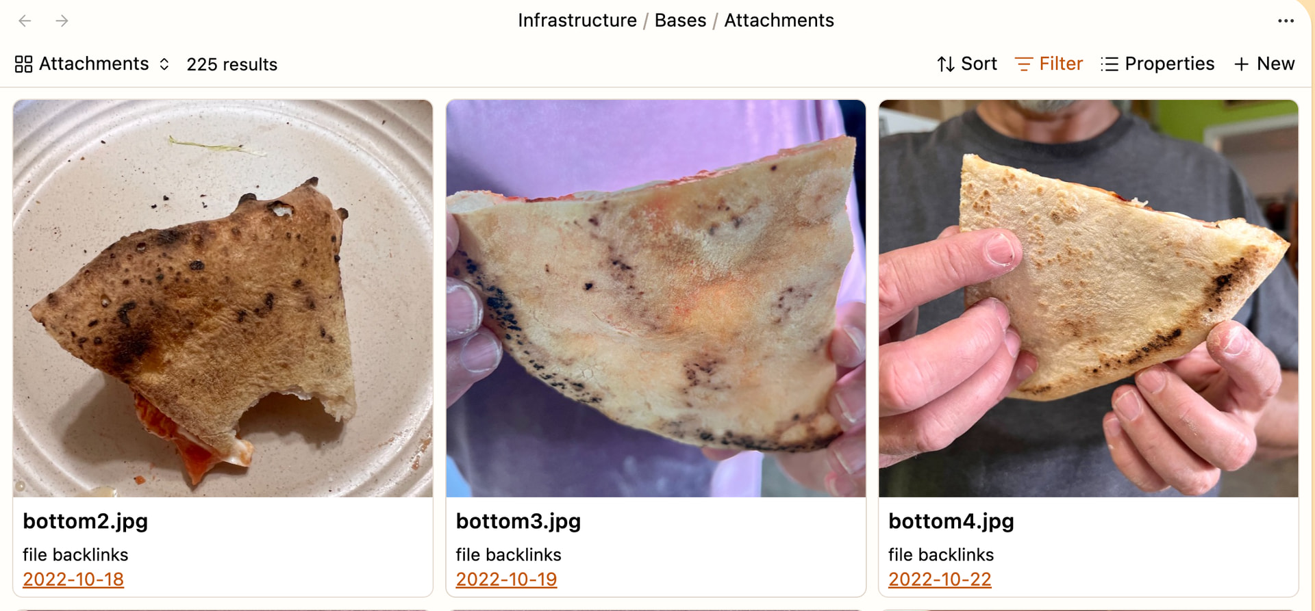 Everything looks good to me, except you have â0 resultsâ showing next to âImage Gallery.â What I would do is delete the base and start over. First thing you need to do is make sure your base is seeing your image files. You should be able to do that by creating a new base (the results counter should show a high number), stick with the Table view. Just change the âThis viewâ filter to âfolderâ âisâ âchoose the path to your attachments folder.â The results counter should have changed to a 5 or whatever number of files/images you have in Attachments folder. Once youâre there, you should be able to create the custom property, and change to a Cards layout.