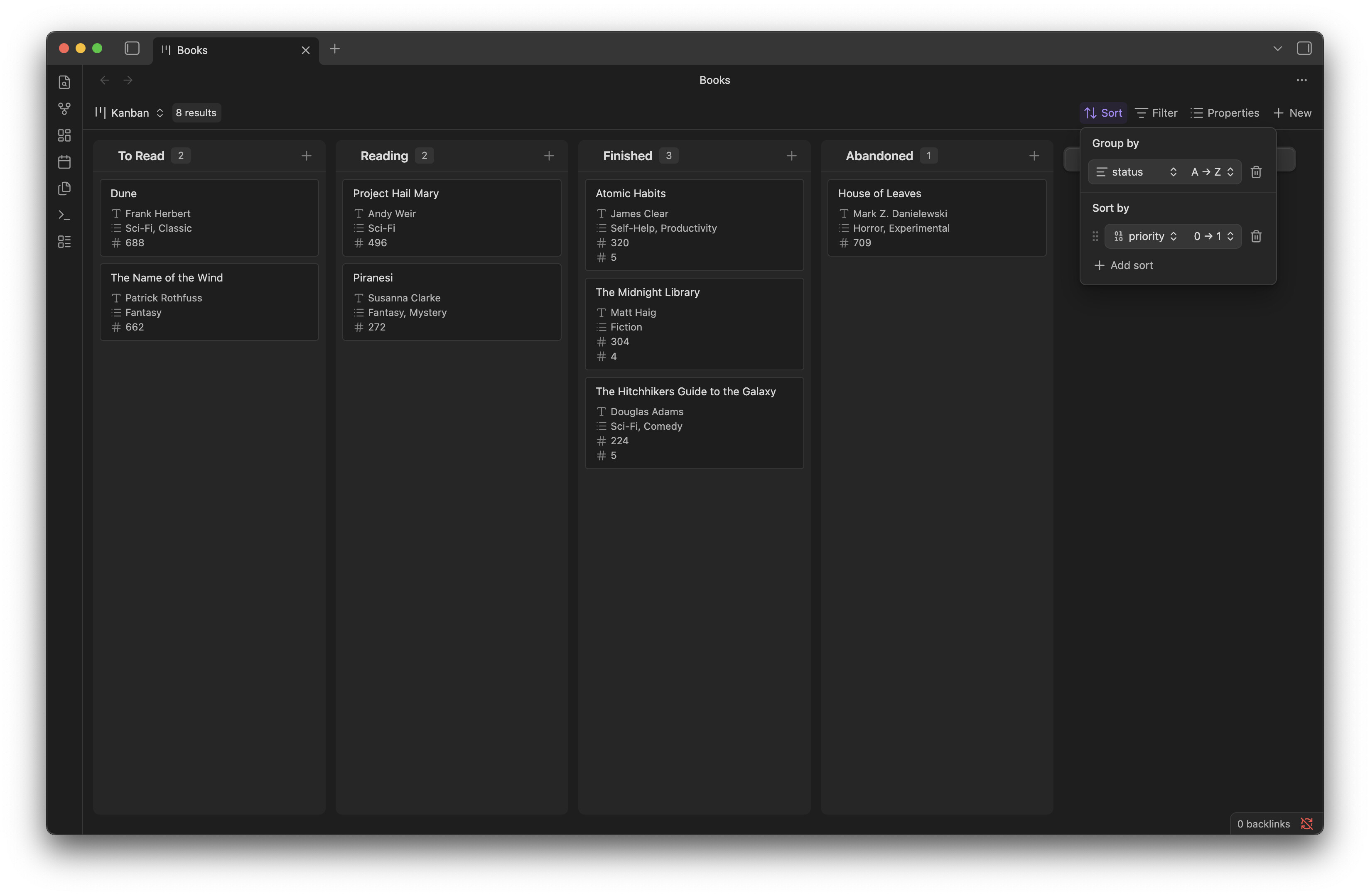 There are still some shortcomings, of course, but honestly, this plugin is the best of those that have already been made. Firstly, because here, in accordance with Obsidian’s logic, the separation is done using the built-in grouping function. And secondly, because here it’s possible to change the order of cards with drag and drop, and changes are automatically made to the order property.