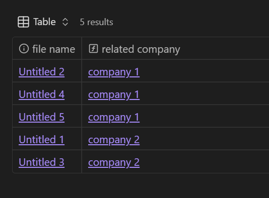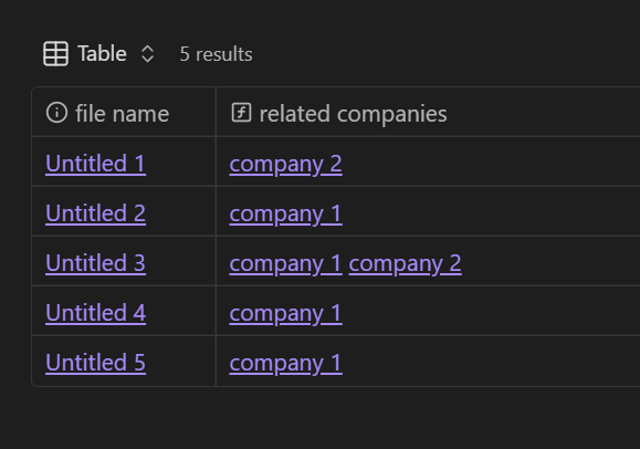 I currently have a Base called “Companies” that lists six notes, each referring to a specific company. All of these have various numbers of backlinks in other notes.