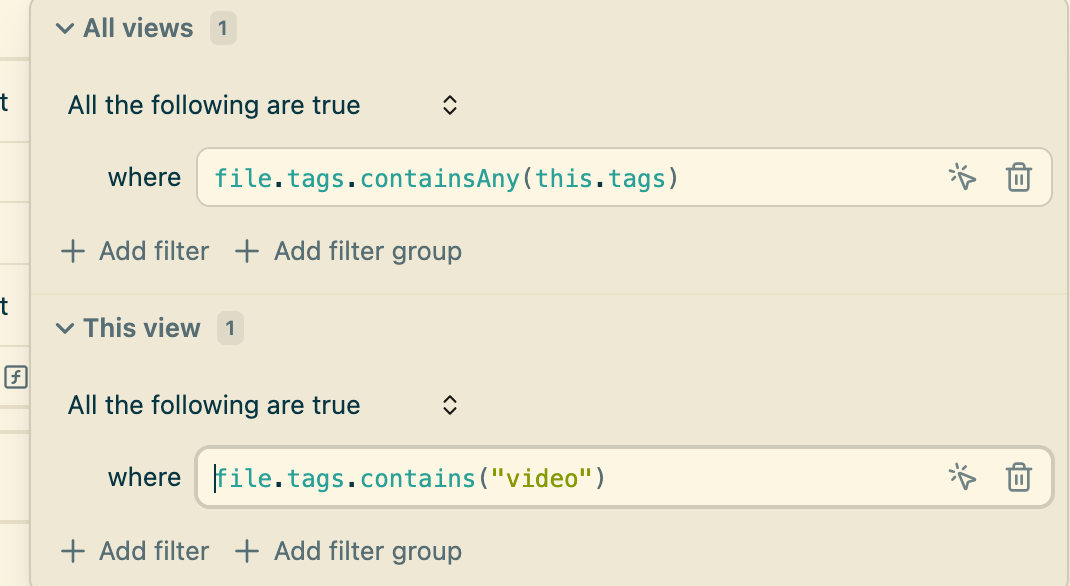 Apply a filter “This view” in the screenshot, but it returns nothing (there are files with video tag in my vault). But if I remove the “All views” filter, the “This view” filter for video tags returns correct results.