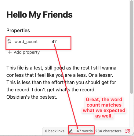 To be clear, here’s the goal: “Create a way of adding a frontmatter property item called word count and have it actually produce the word count and also add/update itself for each note in the vault.”