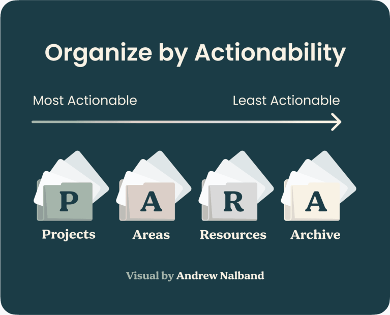 The key idea is: organize notes based on how you’ll use the information in the future, not where it came from.