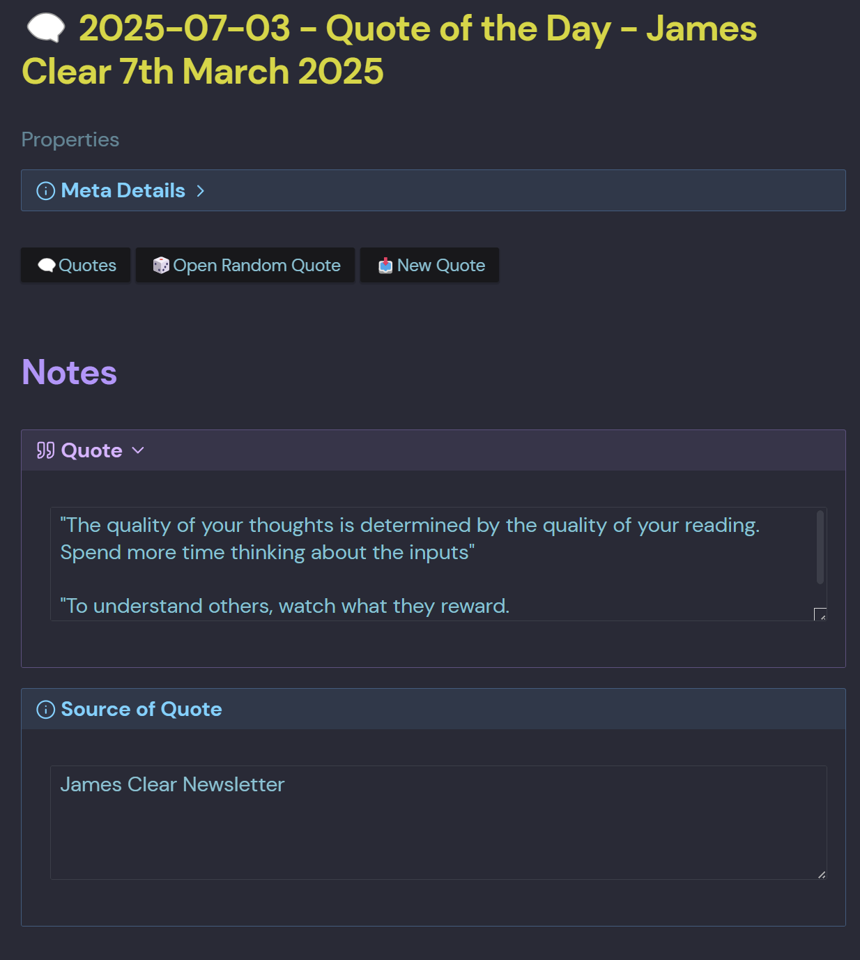 I use a #noteable-quote hashtag, or have a document [type:: Quotes] for my collections of quotations. I have huge libraries organized by topic. They are used when I’m writing as context. I look for them by context, not by tag alone.