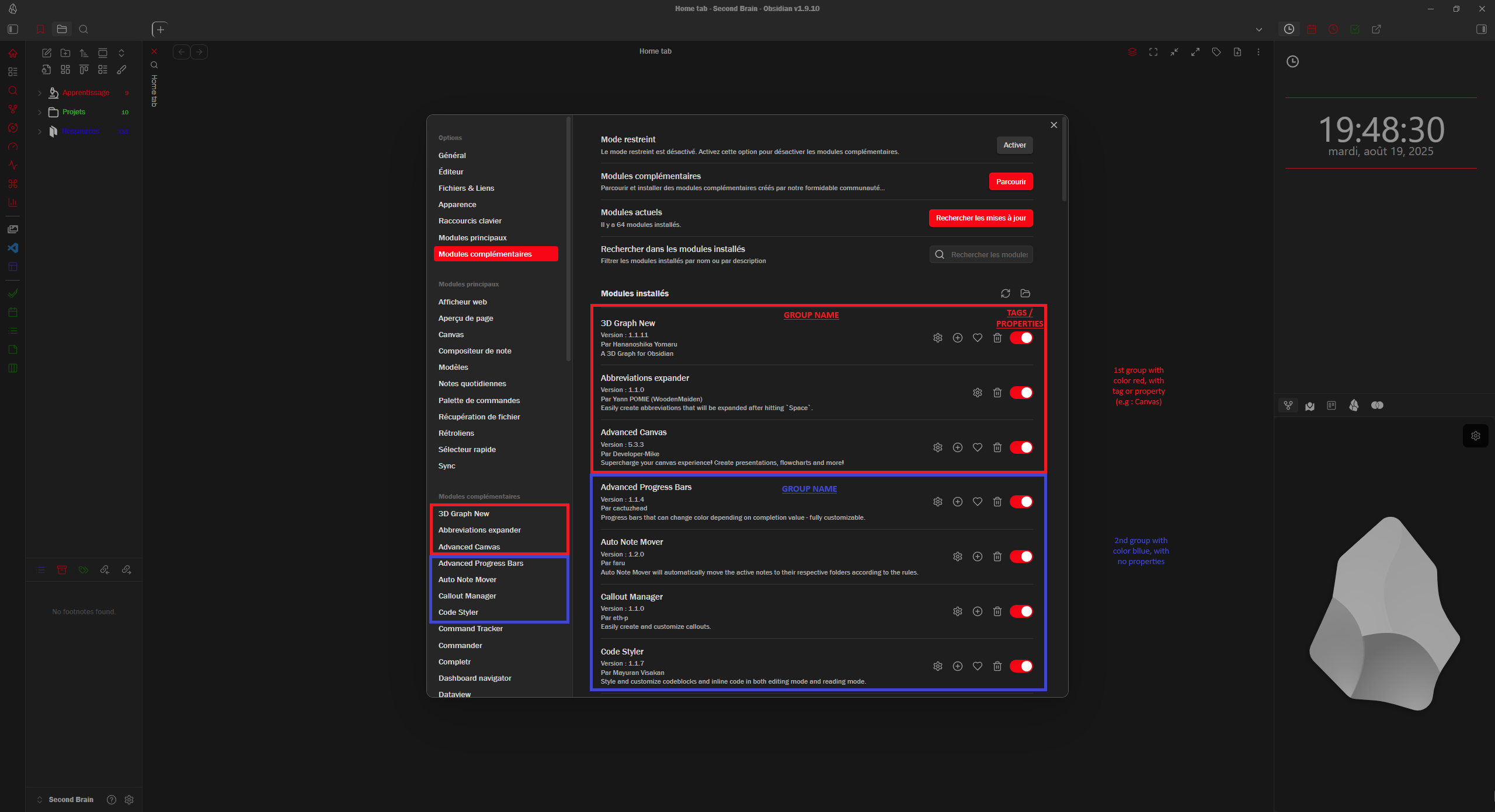 For example, Calendar, Daily notes, and Periodic notes all belong together. Kanban and Todoist Plugin are both task related so they can go together. Style Settings, Markdown prettifier, style settings are all appearance related, so I can group those together, too.