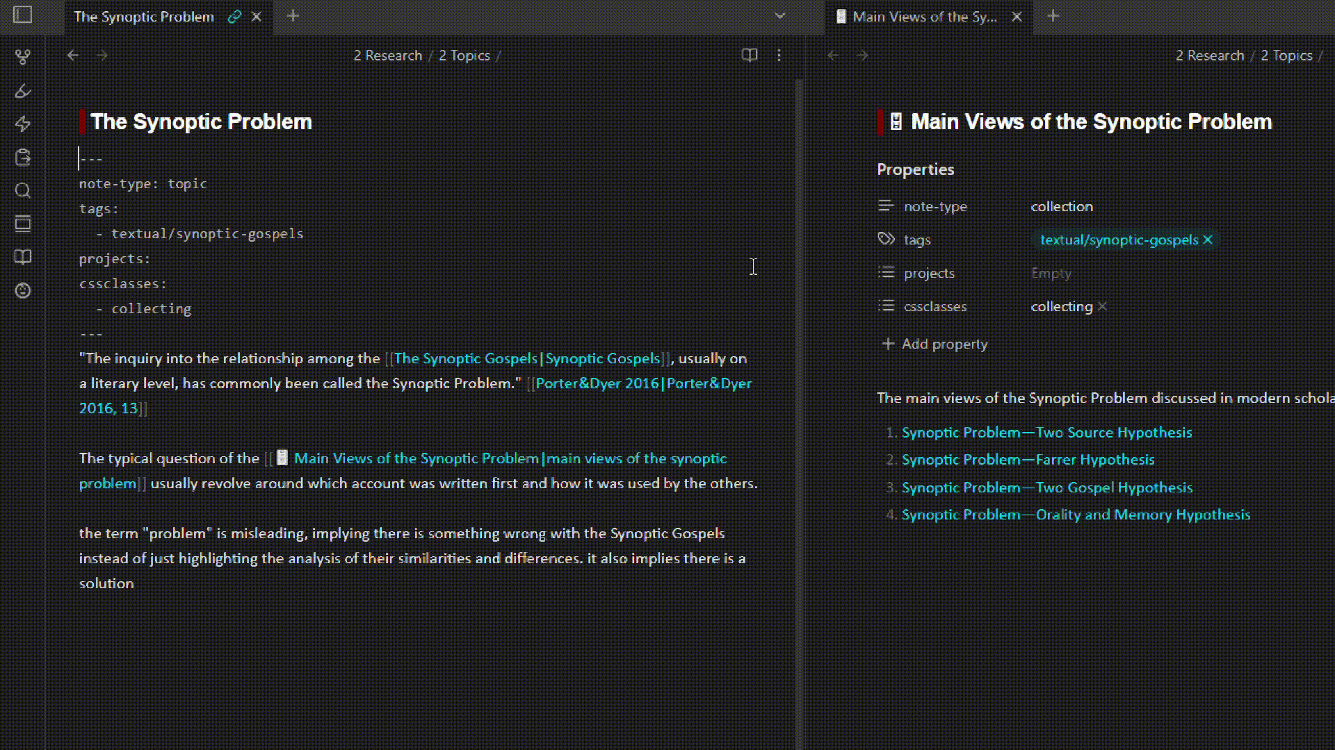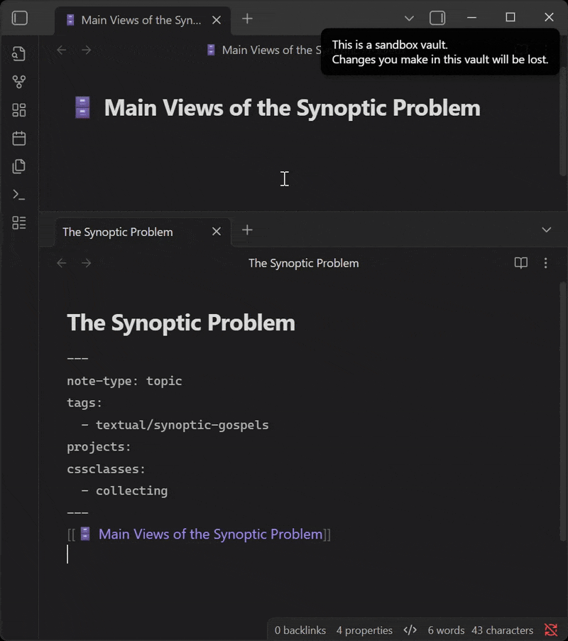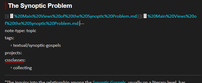 The second note listed (“The Synoptic Problem.md”) has the changing yaml when I rename the first note (“ Main Views of the Synoptic Problem.md”). The second note has an intentional internal link to the first in its body.
