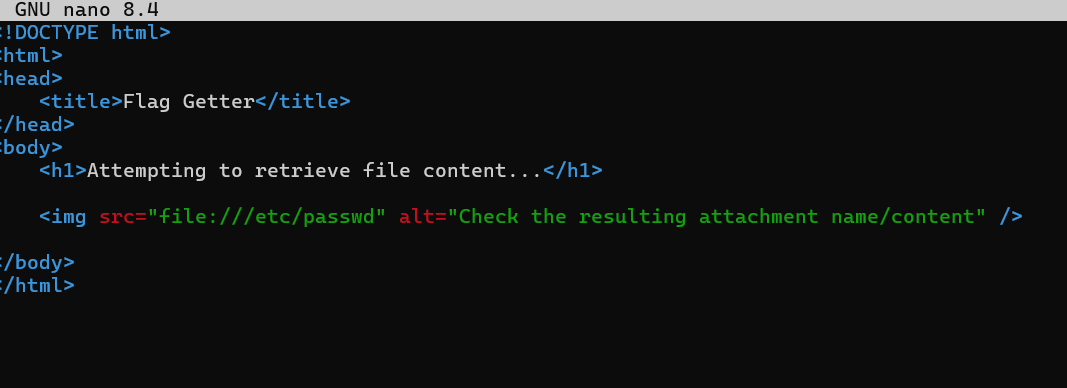 so just open this html file using importer and you will get a file in attachments just change it from .png to .txt and you will be able to read the /etc/passwd