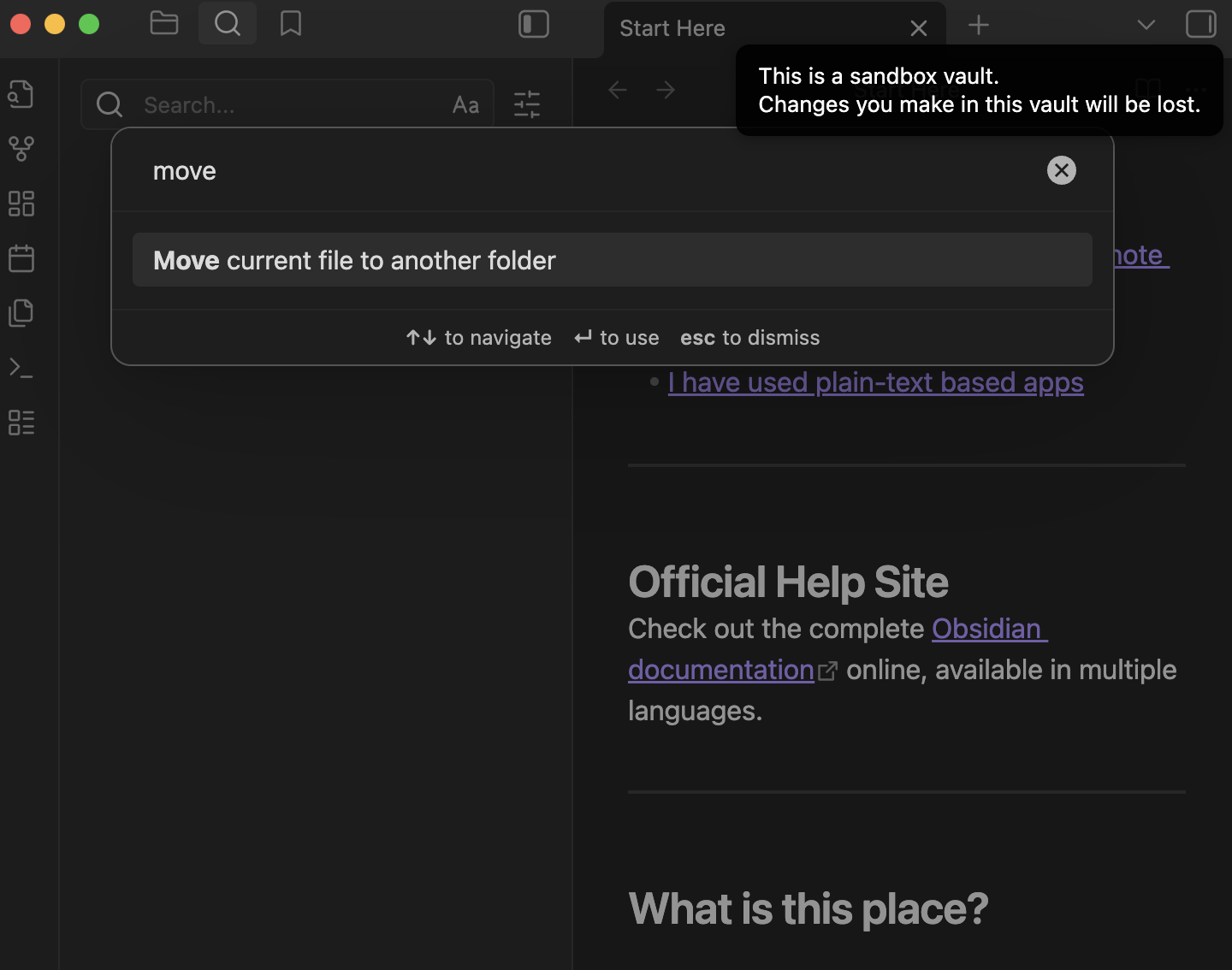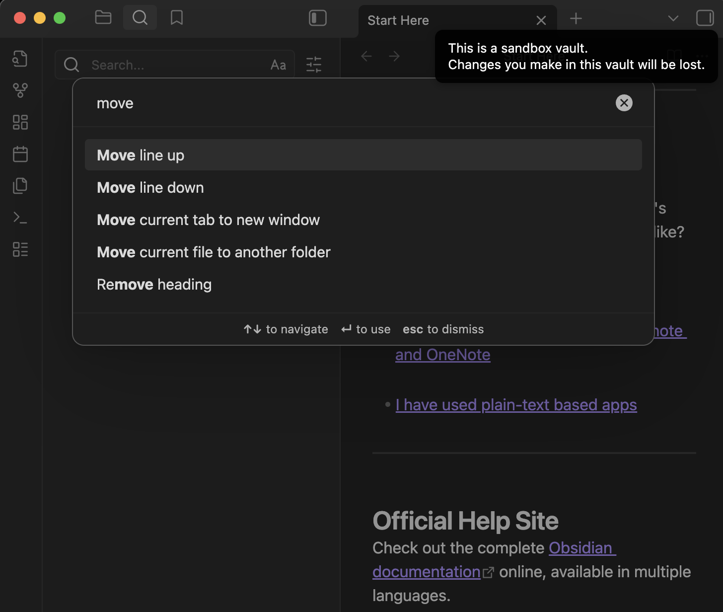 Raspberry Pi 5 desktop → Obsidian Current version: v1.9.12 (Installer version: v1.4.16) → open any file → open left side bar → select Search → type in: move → 873 results → no option: Move line up Move line down.