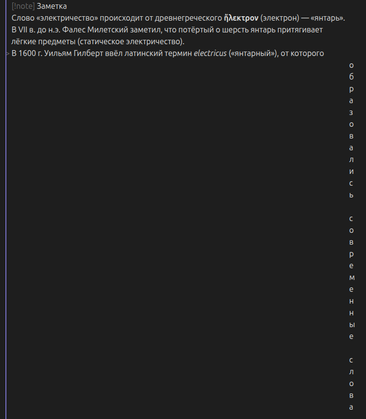 - Open another markdown note, then return to the note with the callout block you just created. Click into the callout block to edit it. The string of text will sometimes be rendered as a single column of text, right justified, one letter per line for the entire length of the string of text. This happens both in Source mode and Live Preview mode, and ONLY seems to occur if there is no space character after the last character in the string of text.