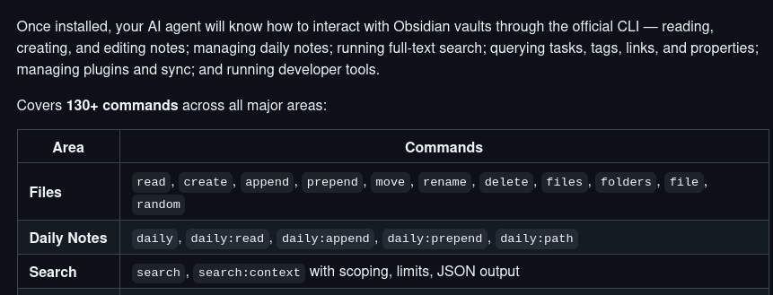 Anything you can do in Obsidian you can do from the command line. Obsidian CLI even includes developer commands to access developer tools, inspect elements, take screenshots, reload plugins, and more.