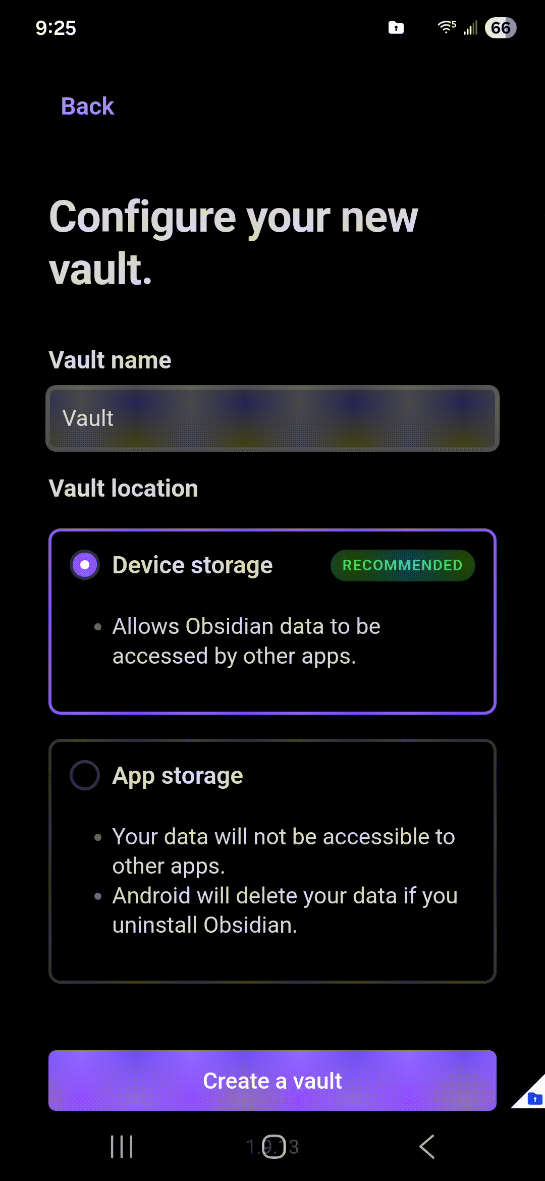 See attached. When you select “create a vault”, the following screen is missing the ability to select a folder.