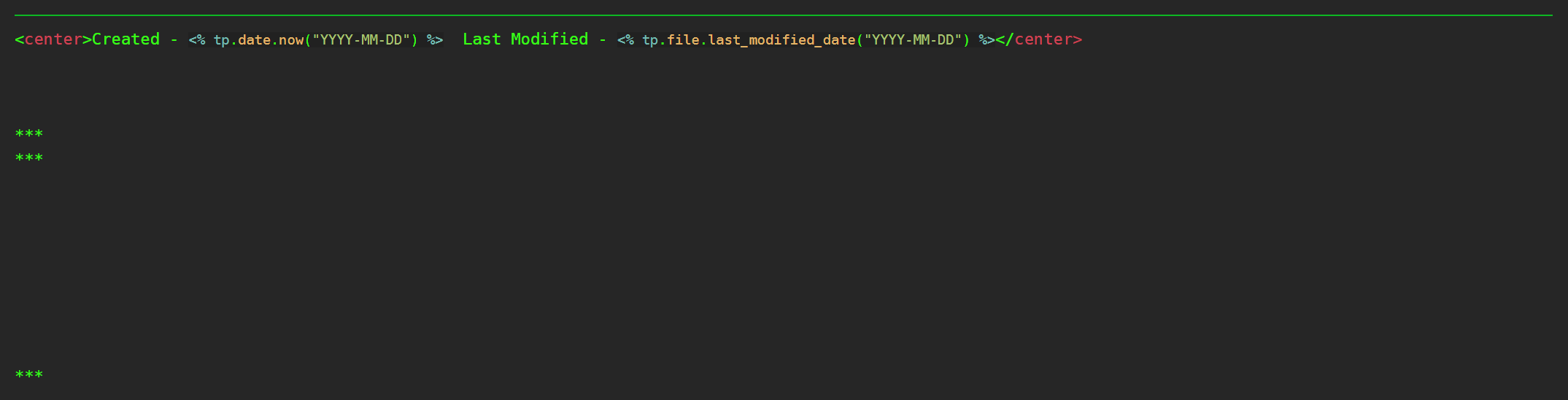 <center>Created - <% tp.date.now("YYYY-MM-DD") %> Last Modified - <% tp.file.last_modified_date("YYYY-MM-DD") %></center>