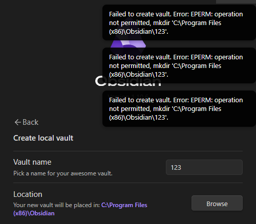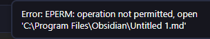 Have a search in the forum here for the EPERM error. It tends to be a permissions issue. i.e., Obsidian can’t read/write to that location for some reason.