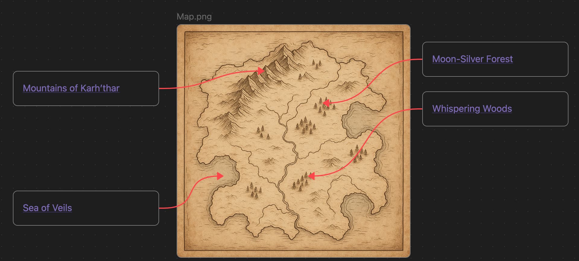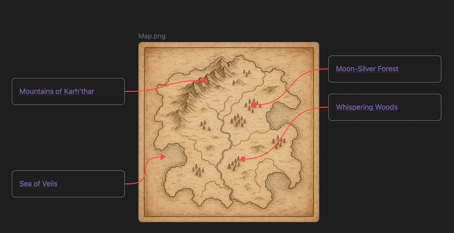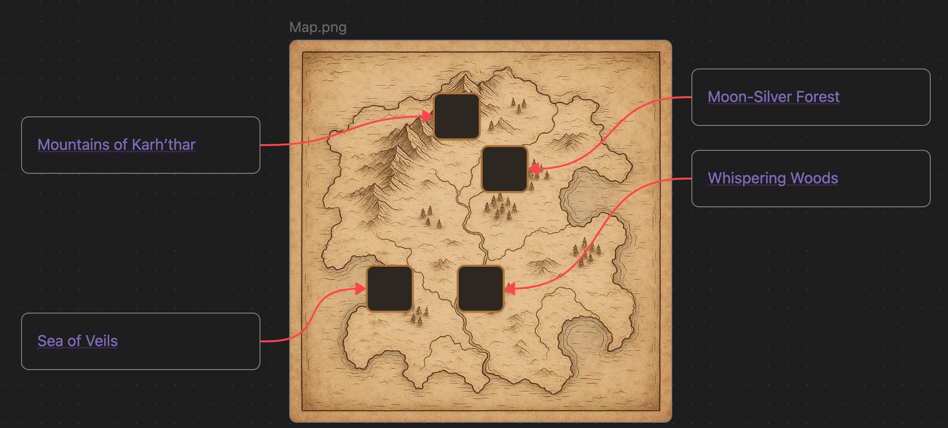 In canvas image, when I add a card, I would like to anchor on some element (properties by example) or better. I have images in my canvas, like a drawed map (a game map) and would like to link some point to cards (for explanation, and so on).