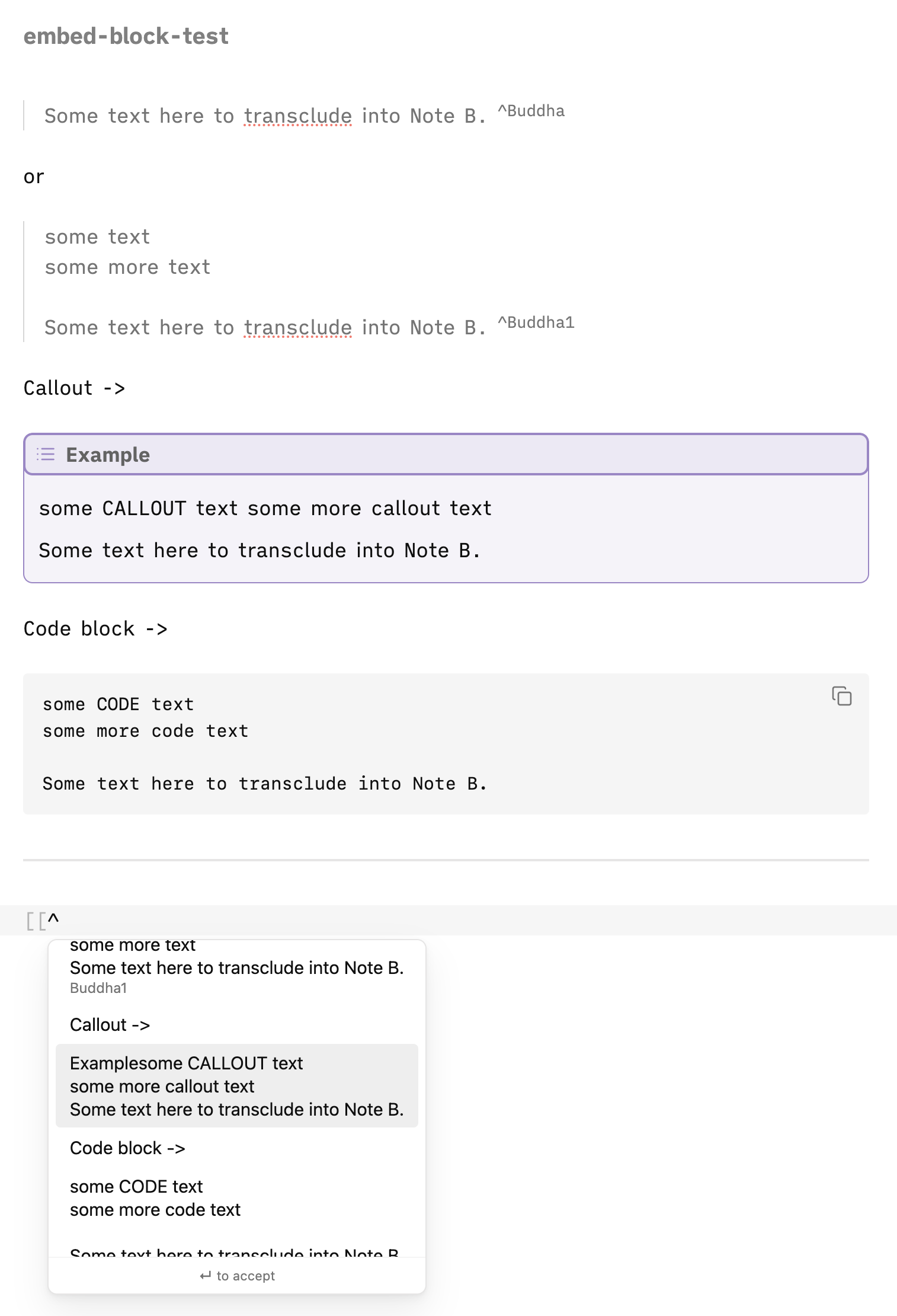 I want to transclude a quote block from Note A into Note B. I don’t see the “Copy block link” option, no automatic reference link is created, and when I create my own text it goes into superscript.