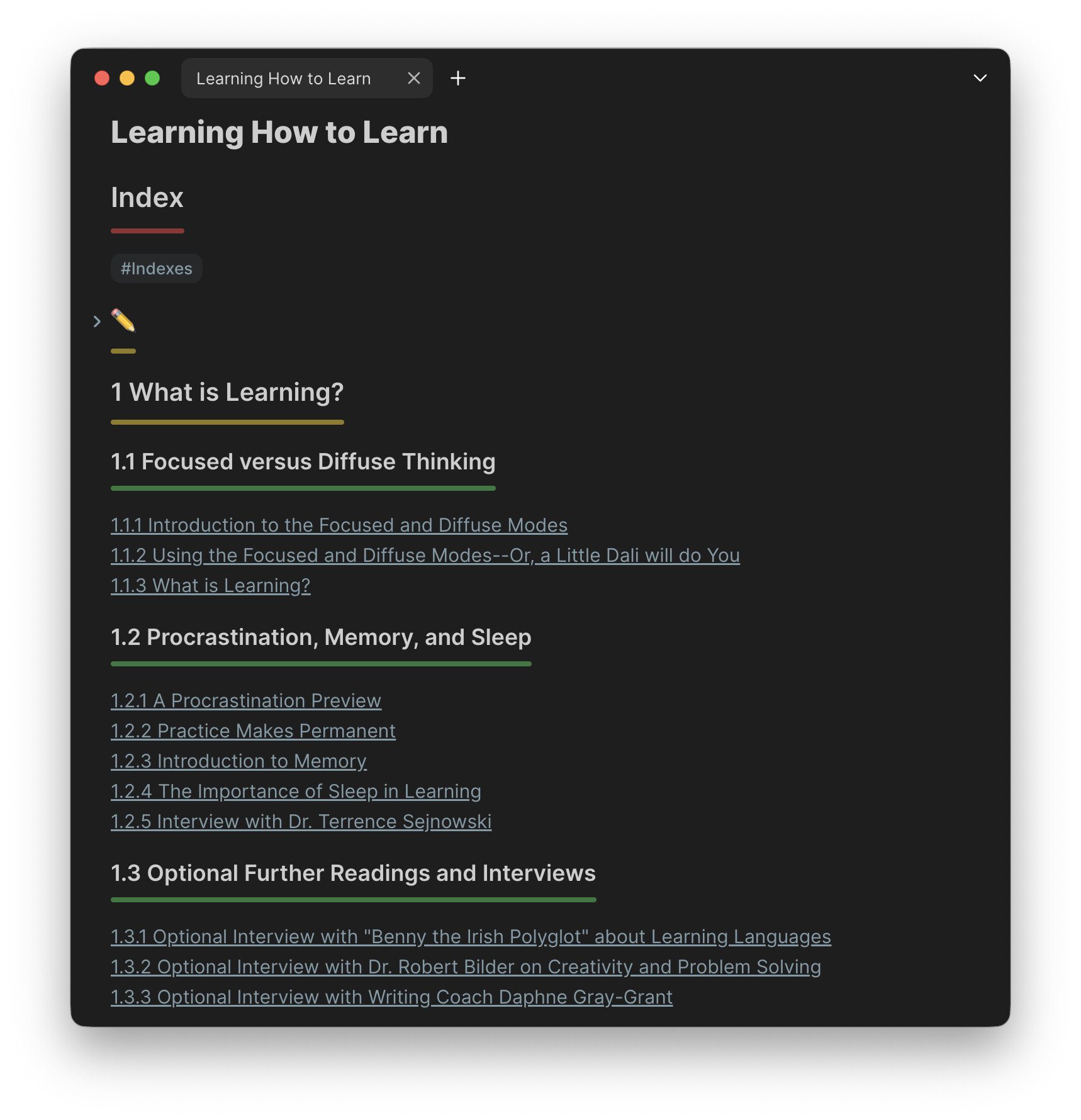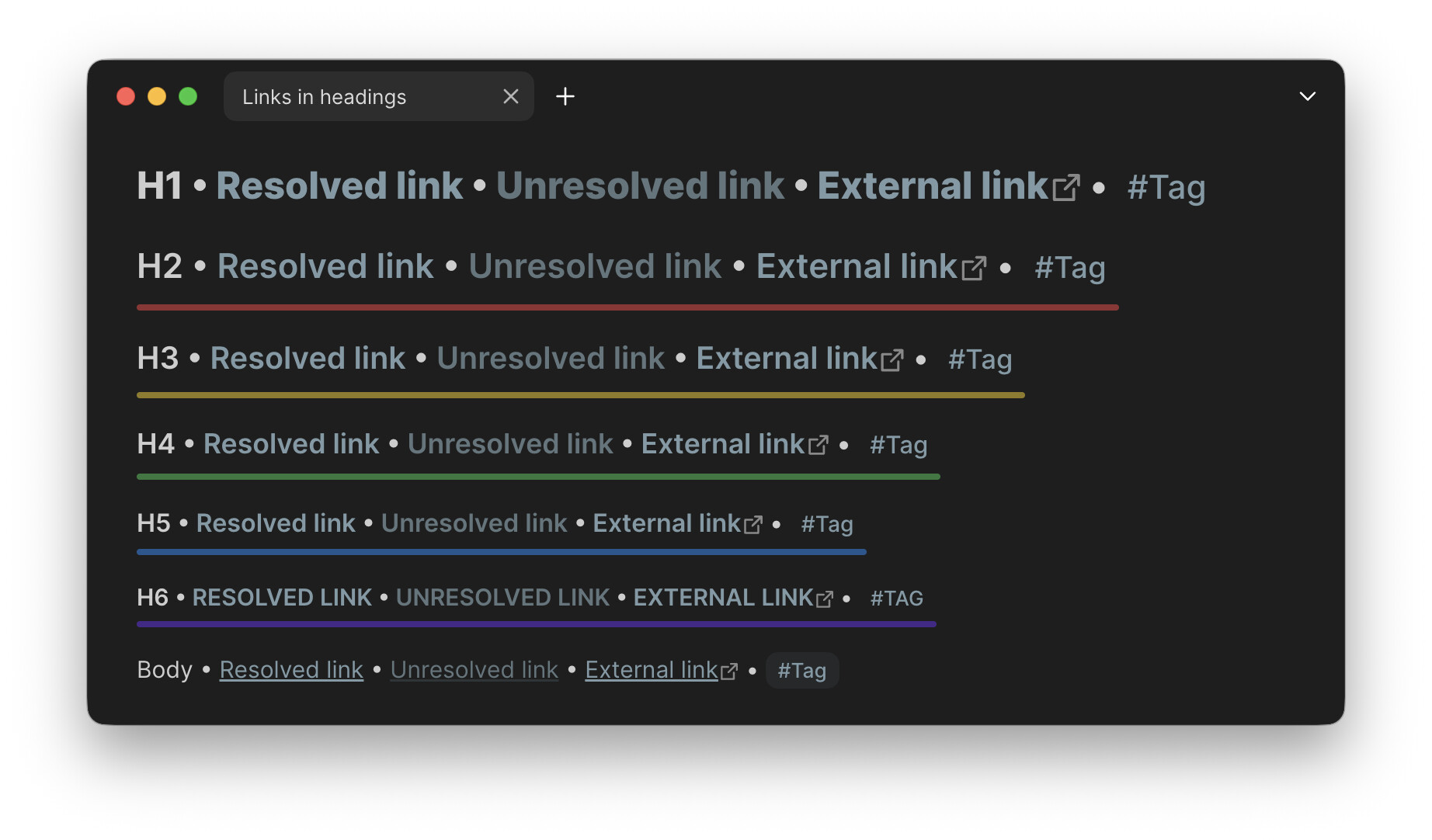 I like to use color to discern between different heading levels. But I find coloring heading text to be too drastic (and it doesn’t account for emoji-only headings), while small indicators to the left of headings aren’t prominent enough to quickly gauge the level. So I came up with a CSS snippet that adds colorful underlines beneath headings: