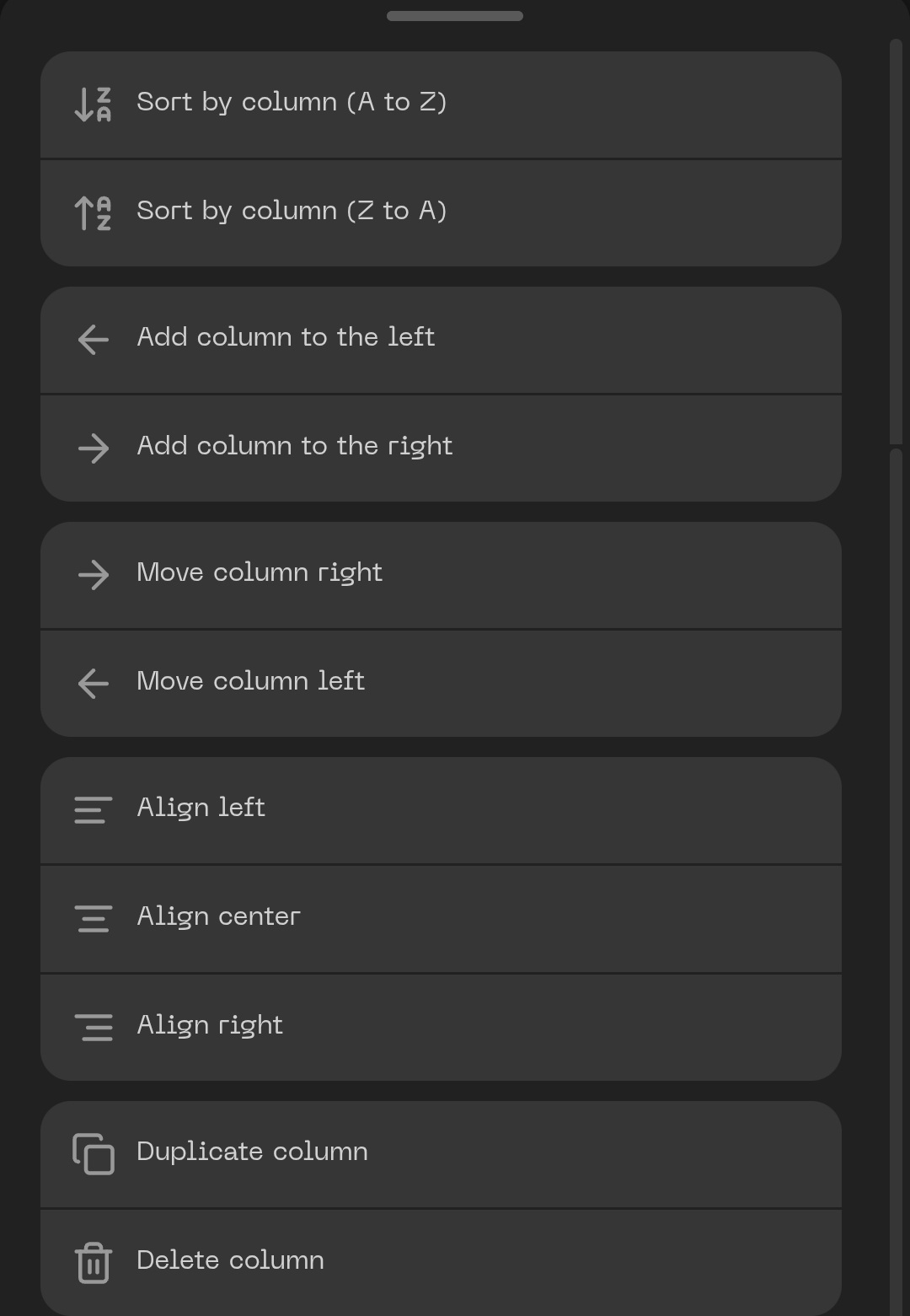 One of the key missing features while working on mobile that I miss the most from desktop is the ability to copy an entire row or column from a table and place it inside another table, even if from another note.