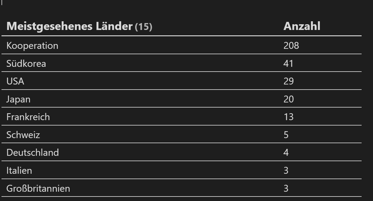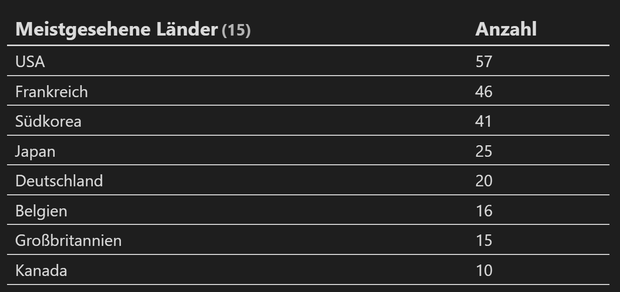 dv.table(["Meistgesehenes Länder", "Anzahl"], countryData);