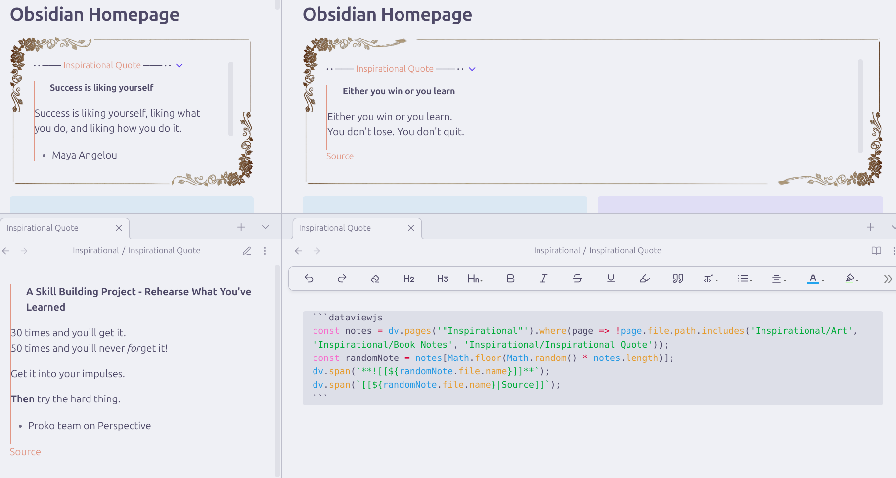 “Homepage” file has a custom callout that has an imaged Wikilink to the “Inspirational Quote” file which has a dataviewjs script that pulls random notes from my “Inspirational” folder, except the “Inspirational Quote” file itself, and now two subfolders (might be convoluted but works for me!).