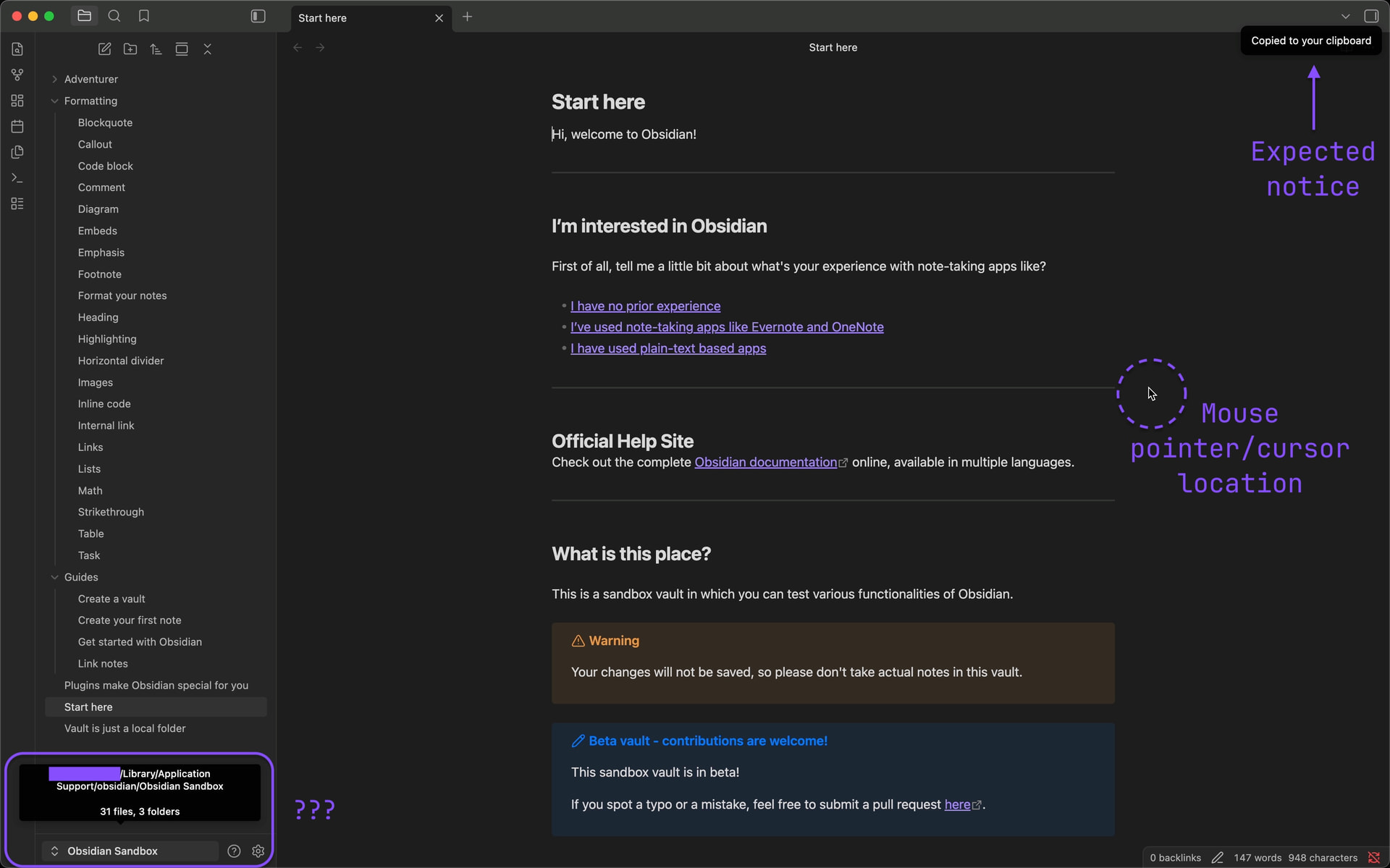 Open the Sandbox vault in Obsidian