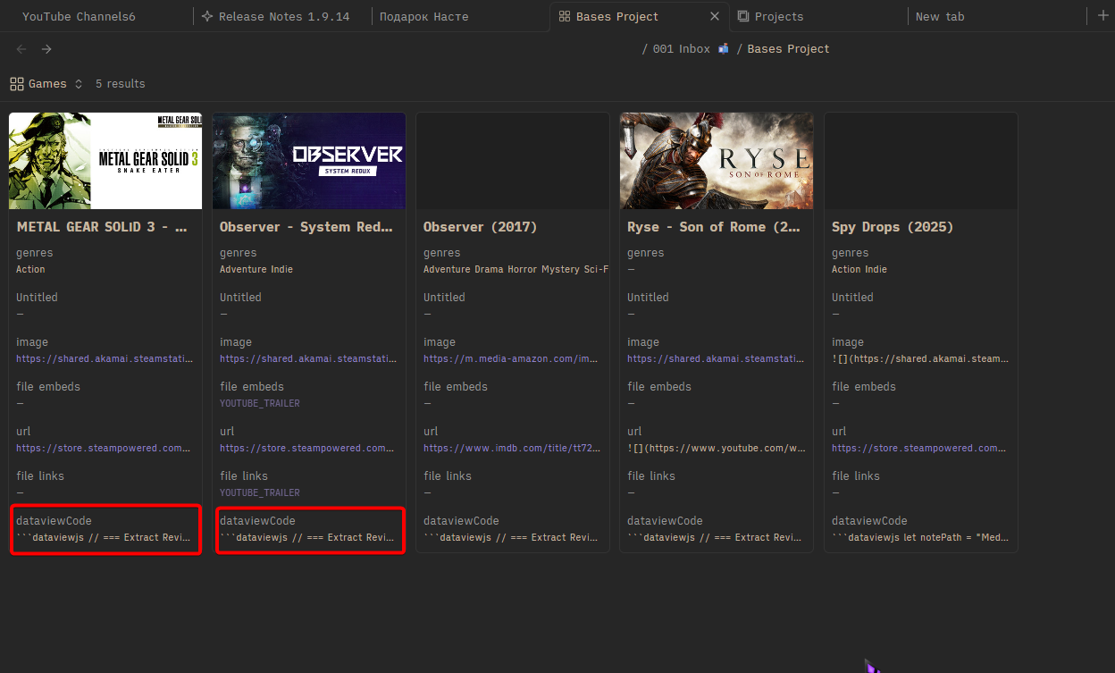 To make it output my reviews from Media DB created notes, I wrote a dataviewjs script in all such notes’ frontmatter that would grab the text from the body of the note, from a specified place.