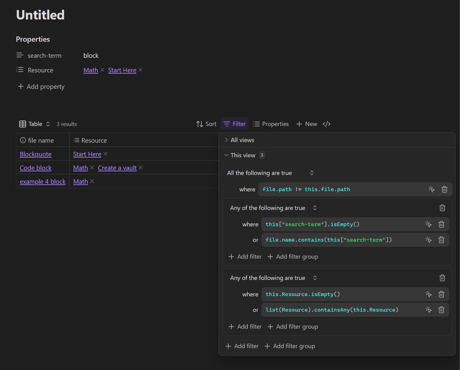 I want to embed a database in a note and configure the filters via YAML properties. Basically, I want to be able to specify the captured resources and areas using Meta-Bind, for example.