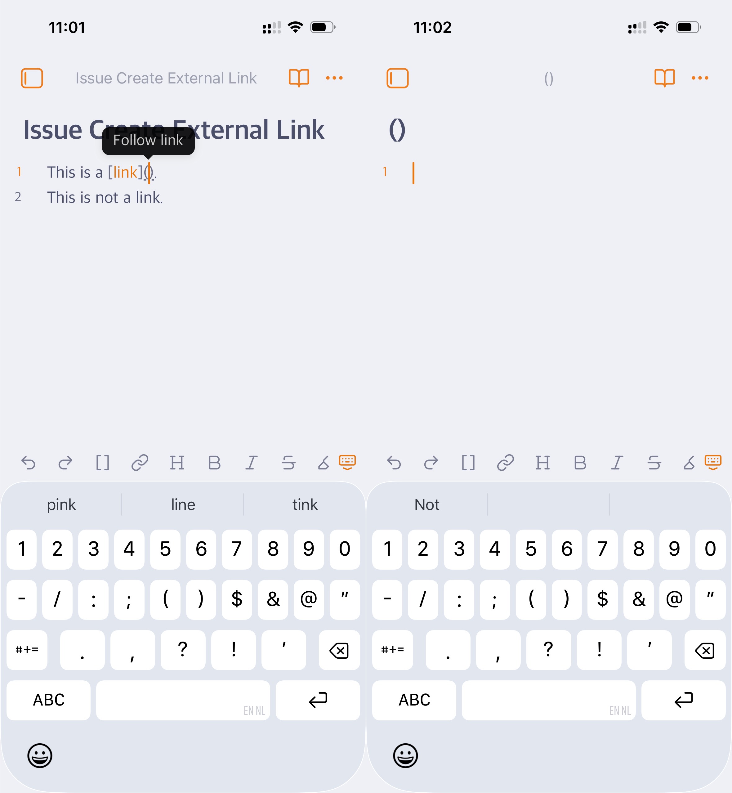 In Obsidian, when clicking on the Create Hyperlink button when text is selected, It adds the [ ] ( ) characters. And here starts the frustration, the cursor is placed inside the ( ) with a popup saying “Follow link”. The frustration is that I have to tap the cursor - note that this is with my finger on a mobile device - without tapping the “Follow link” popup. The chances that I manage to only tap the cursor and get the iOS popup to paste hyperlink are very slim. I do have to strongly point out that at this point, it is distracting my thoughts on what I am thinking of and what I was writing. If I do this, then a new ( ) note is created. Very very frustrating. Now I have to delete the note, which is a couple of more actions that I need to do. Again, I do have to strongly point out that at this point, it is distracting my thoughts on what I am thinking of and what I was writing.