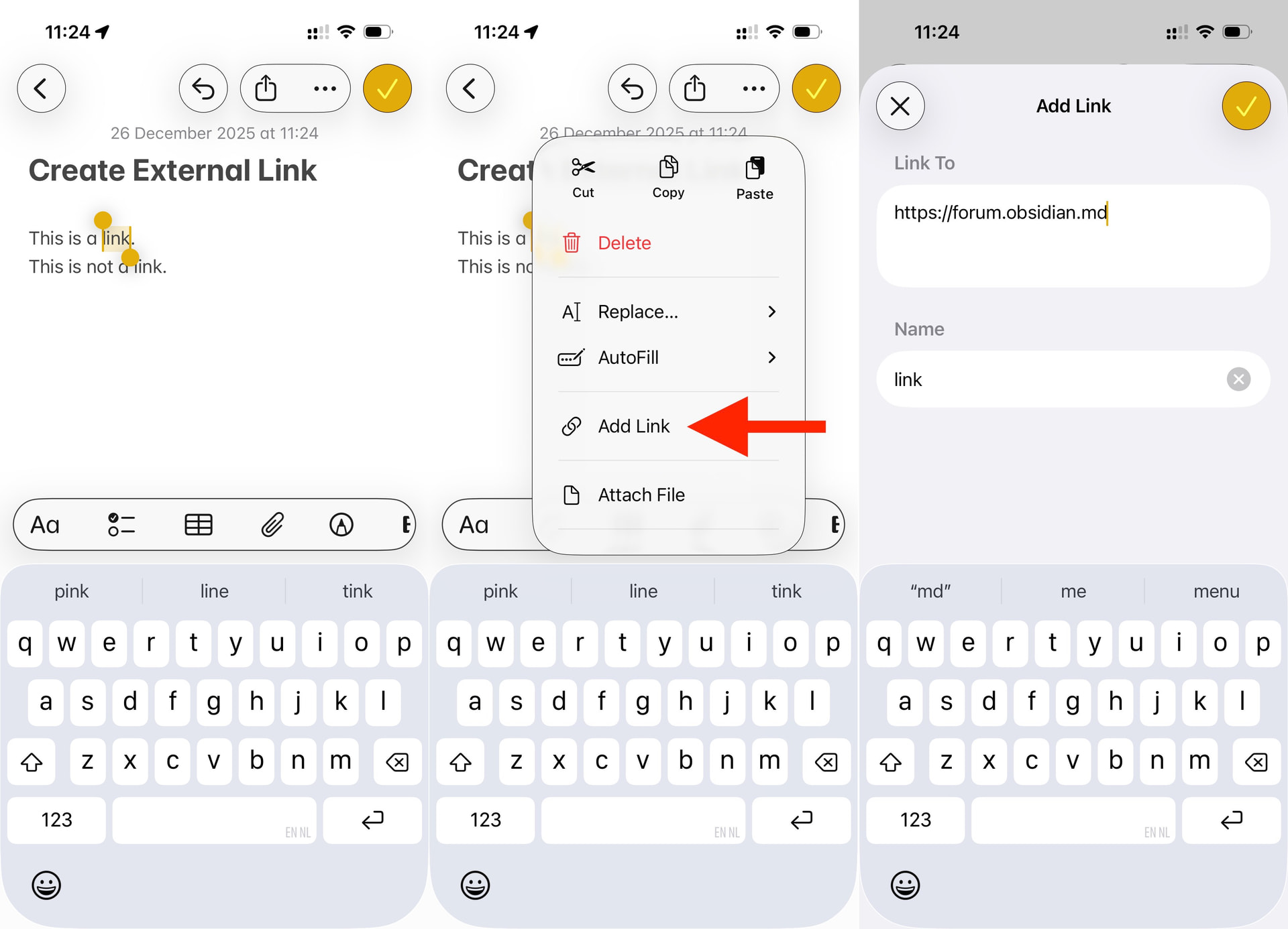 Obsidian is a very great application. And I take a lot of notes on my iPhone, which I have always on me. In my notes I create a lot of external links to sites that are of intrest to me. But changing the selected text into a hyperlink is so complicated and frustrating to do that I keep going back to Apple Notes.