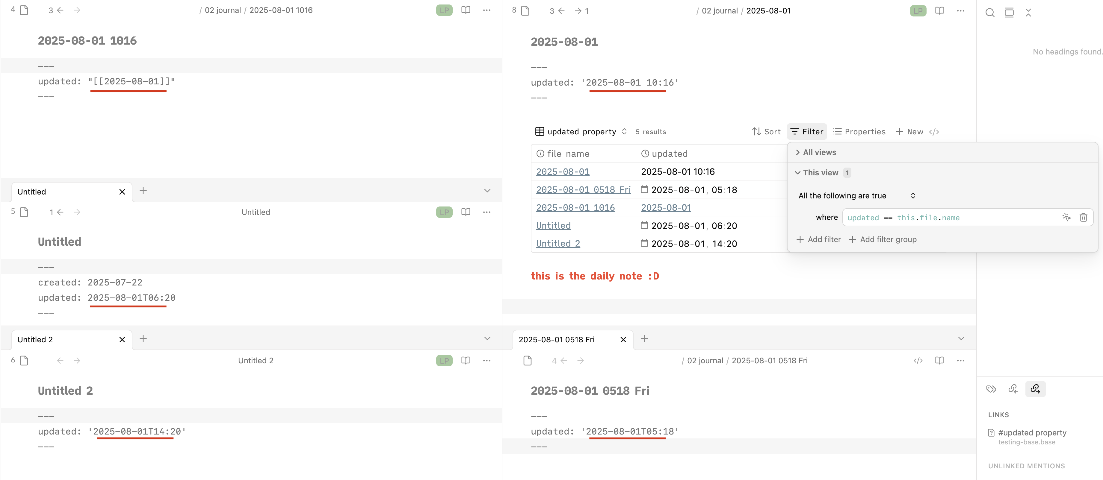 updated: (property) date/time as the daily note that the ![[embedded.base]] is in, is that correct?YYYY-MM-DD?updated: value in notes? e.g.