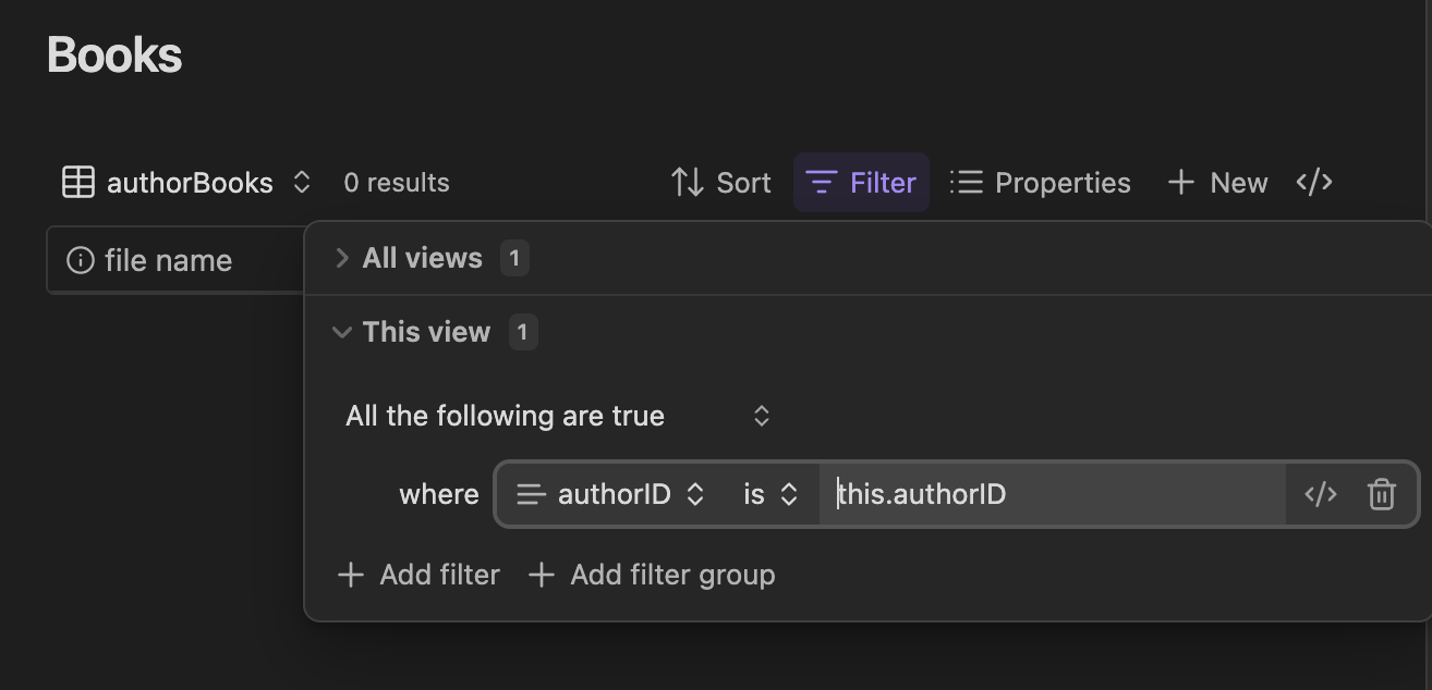 I want to embed a base in the AUTHORS note that only shows the books with the corresponding authorID.