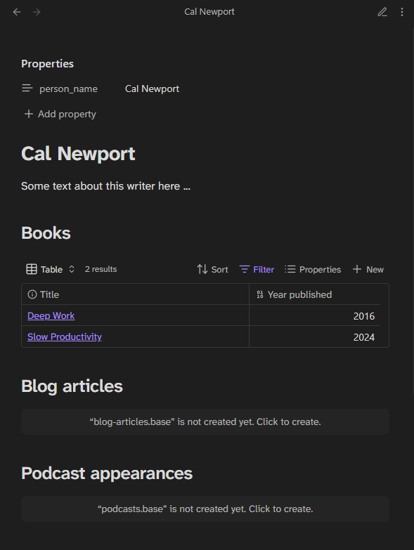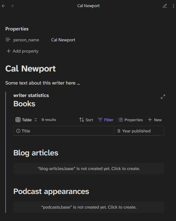 I have a template/file for people, let’s say writers. In the file of each person-writer, I want a section where I list: