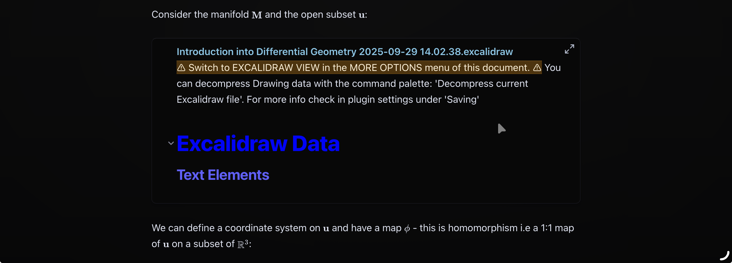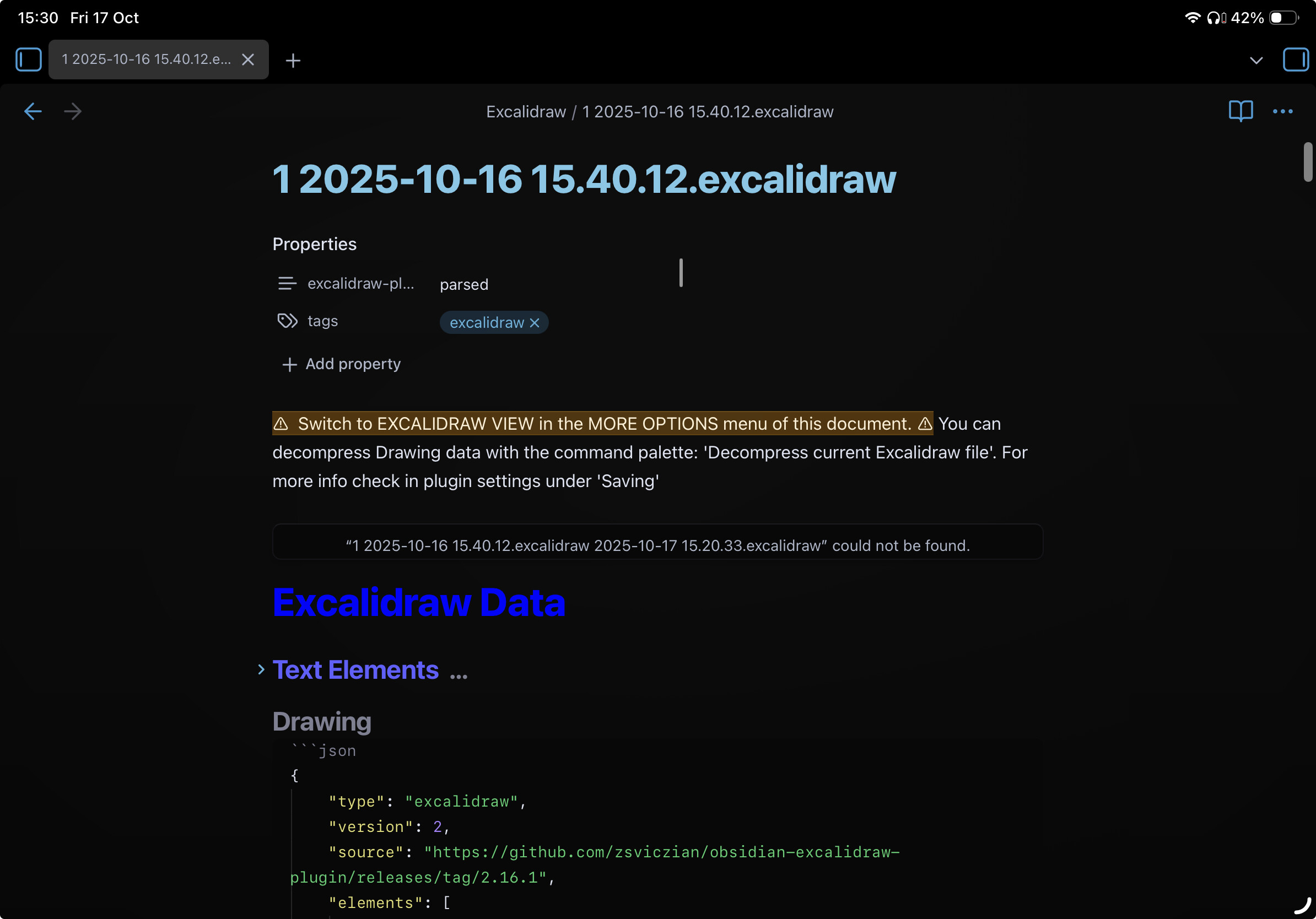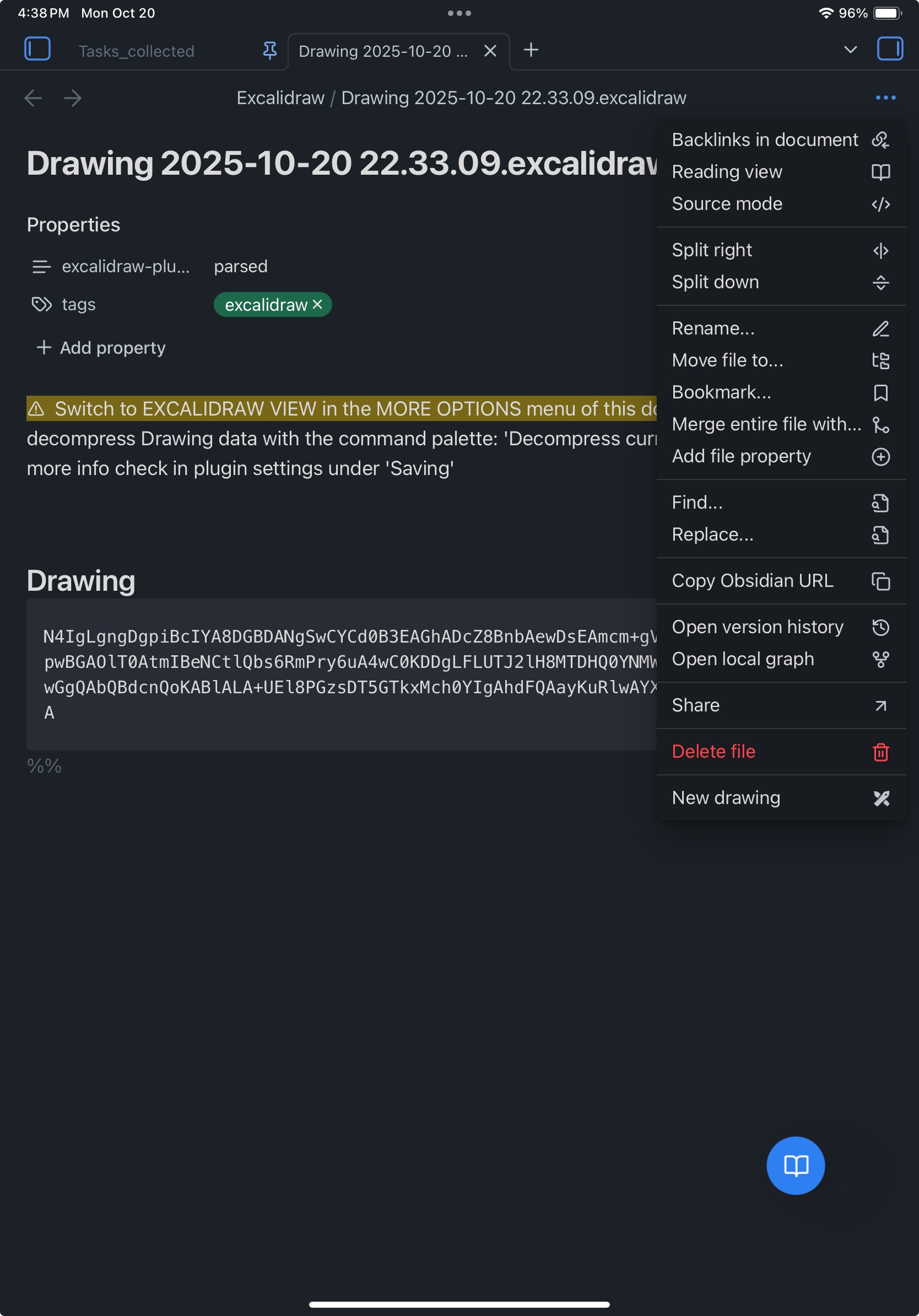 For reference, I am on iPad and “Excalidraw view” does not come up in more options of the file. I have tried reloading plugins, turning it on and off which does briefly fix by allowing me to open some of the drawings as a drawing but not all of them.