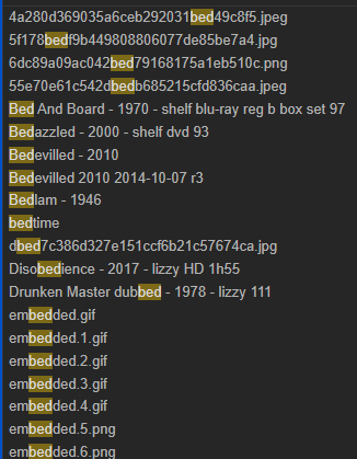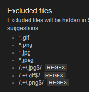 Sorry, I don’t understand. The rule *.jpg works fine in that it hides all files with the .jpg extension when searching (except for when filtering the search). Are you saying that if I used the regex instead all .jpg files would be excluded EVEN WHEN I searched using file: search or path: search?