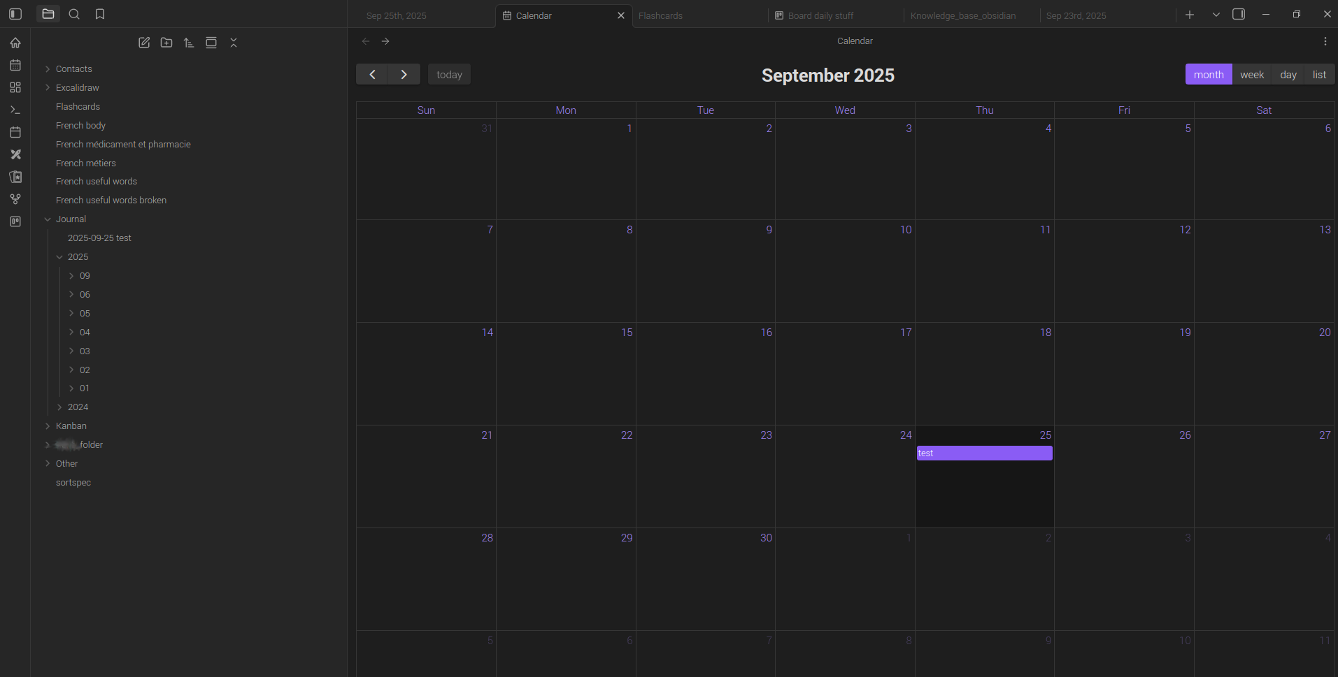 - Created a test event in Obsidian Current version: v1.9.12 (Installer version: v1.4.16) ā left side bar ā Ribbon ā Open Full Calendar ā Calendar tab ā month ā selected Calendar day blank space ā Add title: test ā Journal ā Save Event ā event saves in Files/Journal/2025-09-25 test2, rather than in Journal/2025/09/Sep 25th, 2025.