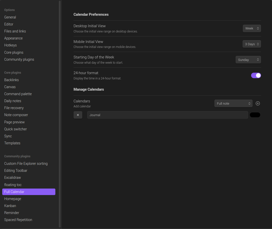 - I navigated to Desktop ā Obsidian Current version: v1.9.12 (Installer version: v1.4.16) ā left side bar ā Settings ā Options ā Community plugins ā Full Calendar ā Options ā Manage calendars ā Calendars ā Add calendar ā Full note (also tested Daily Note) ā Add Calendar plus icon ā Choose a directory: Journal ā Add Calendar ā Save.