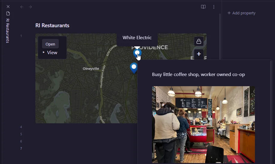 That makes the note available to MapView. So then if I tag the note with something like Restaurants, I can have a map note that collects all the notes that match that tag (for example). Clicking the pin takes you to the note.