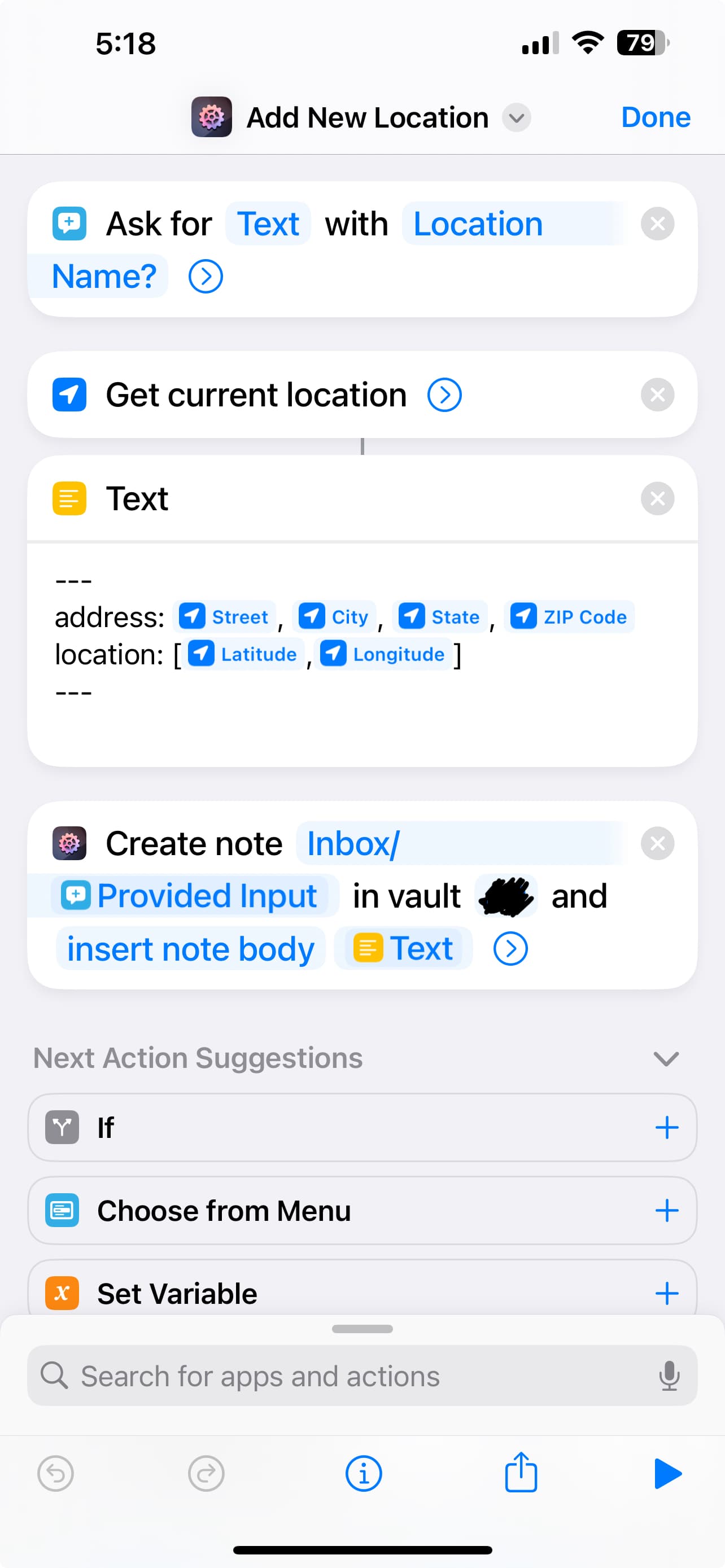 This is the shortcut I made. Now if I tap that shortcut’s icon on my home screen, my phone will ask me what I want to name the note, then create a note with the street address and the lat/long of the phone saved in the properties of the note.