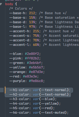 The Things theme sets the h1 and h2 colors to the var(--text-normal) color (the same as regular text):