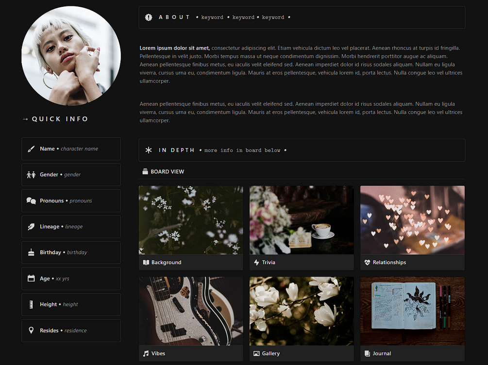 Hello, everyone. I’m new to Obsidian and would absolutely love to start using the program for my “character wikis,” where a database style is at the center of its structure. I have some examples below that capture what I would fundamentally like to achieve: