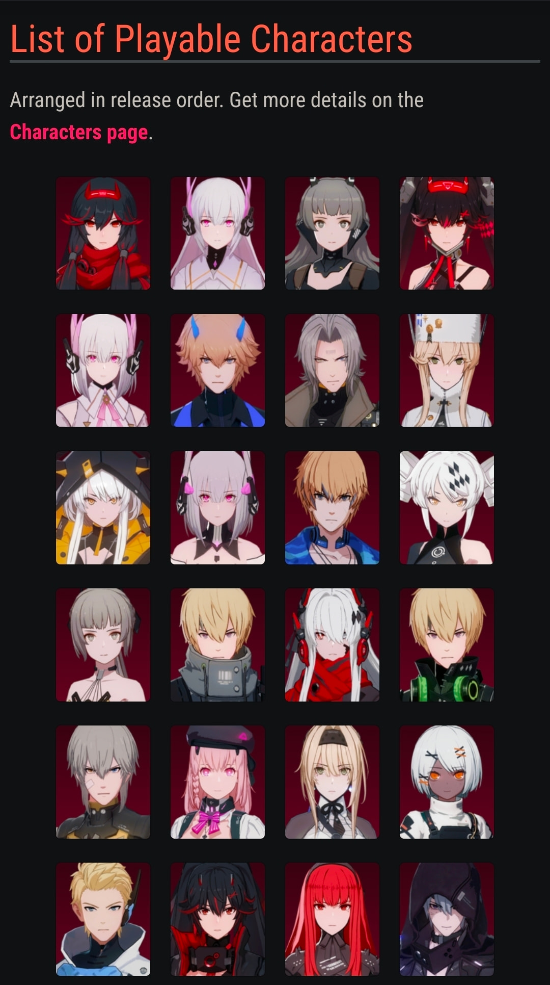 This is a screenshot of part of the Punishing: Gray Raven characters page. When you click on any given avatar, it takes you to their character profile with their stats and other descriptors.